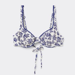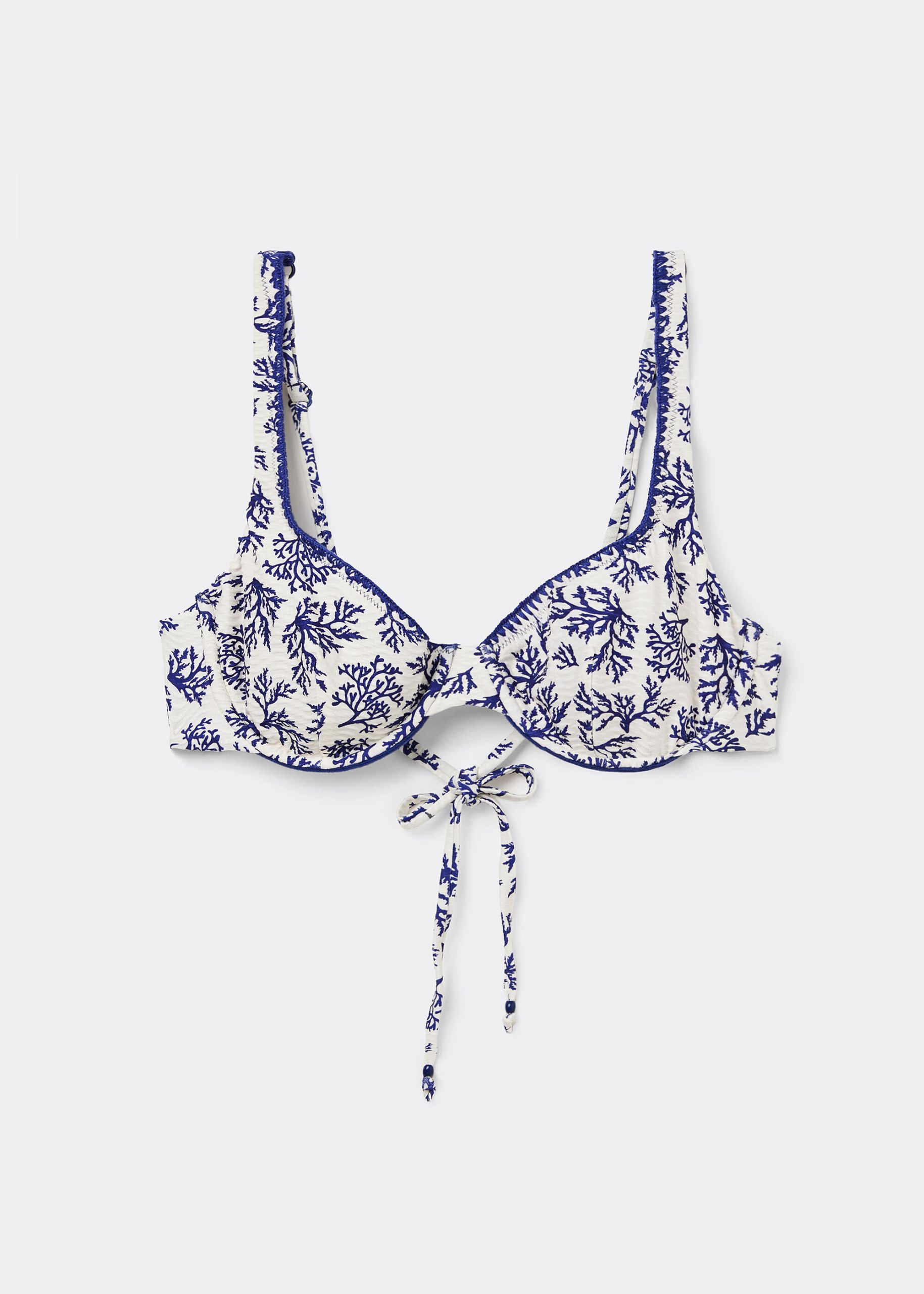 Slightly padded balconette bikini top with high center and underwire that provides excellent support and fits all sizes perfectly. A marine blue coral print on slightly crinkled fabric, which creates a fresh, refined and dynamic effect. Adjustable straps and thin tie closure on the back. Back hook-and-eye closure with two adjusters in sizes XL/40 and up.