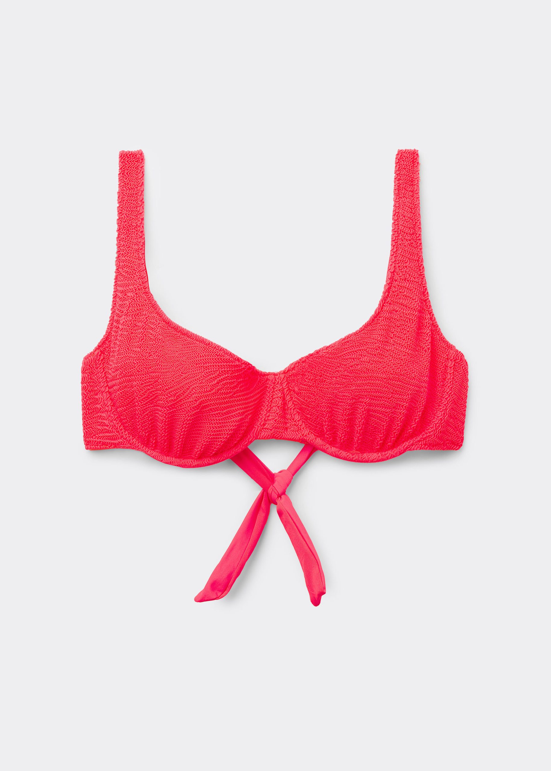 Unpadded balconette bikini top with underwire. The structure of the cups perfectly embraces and supports the bust, while the side drawstring can adjust the fit. Ideal for larger busts. The style features a crinkle fabric with a three-dimensional effect. Adjustable straps and thin tie closure on the back.