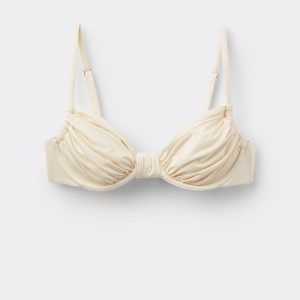 Unpadded balconette bikini top with underwire. The structure of the cups perfectly embrace and support the bust, thanks to the side drawstring on the cups that can also adjust the fit. Ideal for the larger bust. The style features a bright fabric with a silky effect, embellished by ruffles and gold tips. Adjustable straps and hook closure with two adjusters.