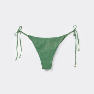 Brazilian cut bikini bottom with side ties to adjust the fit. Soft fabric with shiny lamé thread embellished with nickel free small gold rings. Fully lined. Back gathered seam for a better fit.