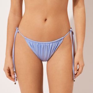 Brazilian cut bikini bottom with side ties to adjust the fit. The style features a bright fabric with a silky effect, embellished by ruffles and gold tips. Fully lined with invisible seams.