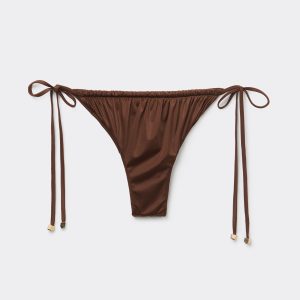 Brazilian cut bikini bottom with side ties to adjust the fit. The style features a bright fabric with a silky effect, embellished by ruffles and gold tips. Fully lined with invisible seams.