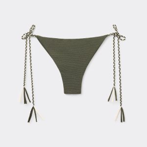 Brazilian cut bikini bottoms with side ties. The slightly rounded waist at the front allows for both a regular and more high-cut fit, depending on one’s physique. The 3D crinkled fabric, enriched by a braided string, provides a touch of sophisticated elegance. Fully lined with invisible seams.