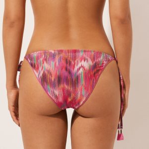 Brazilian cut bikini bottoms with side ties to adjust the fit. The rounded waist at the front allows for both a classic or more high-cut fit, depending on one’s physique. Pattern illuminated by sparkling glitter, with vibrant patterns in a mix of warm and bright tones. Reminiscent of a refined ethnic style. Fully lined. Back gathered seam for a better fit.