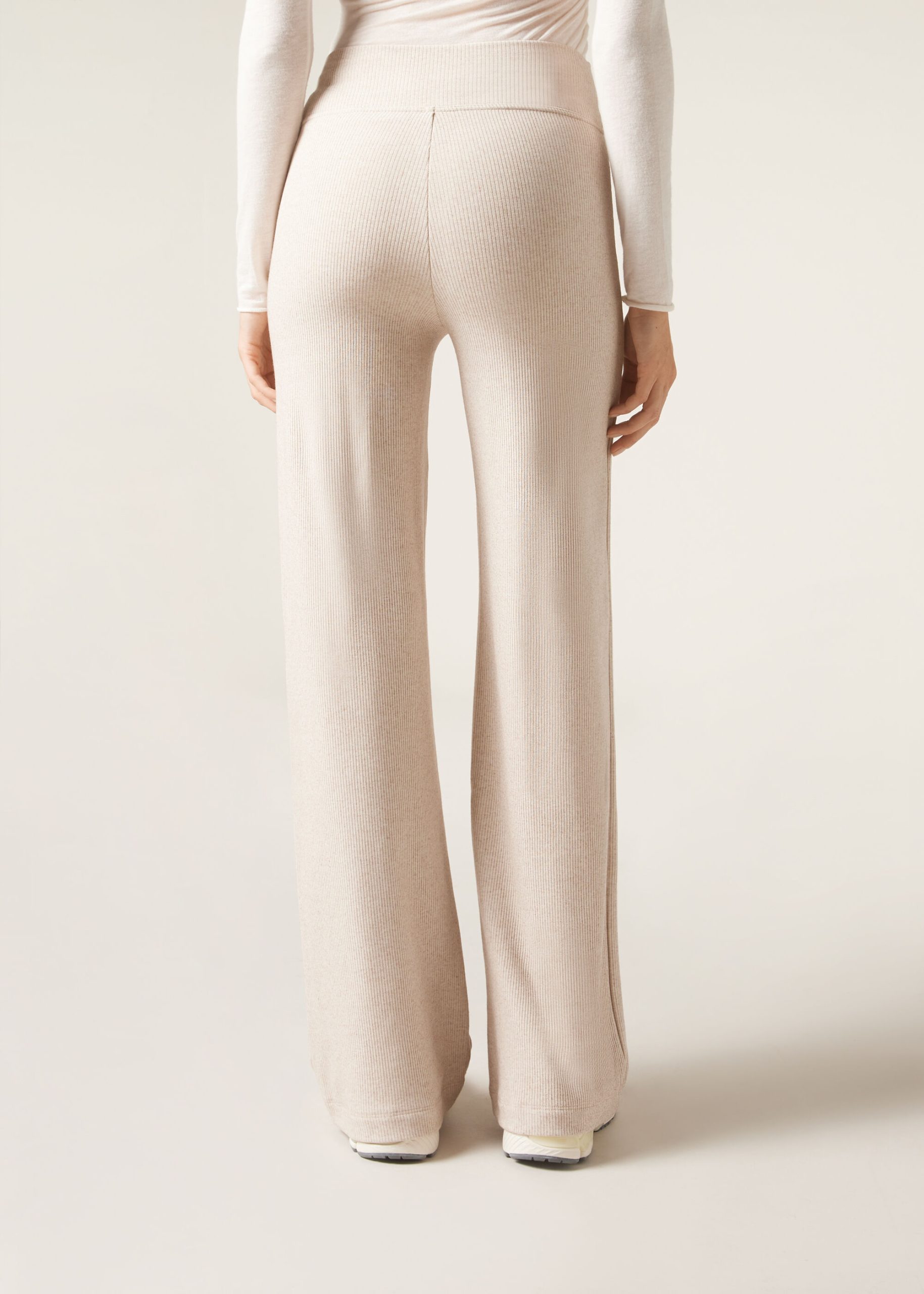 Women’s ribbed cashmere blend modal palazzo pants featuring a comfortable, elastic-free high waist. The fabric is opaque, soft, and breathable, with a brushed interior for a warm and comfortable effect, perfect to combine style and comfort on the coldest days.