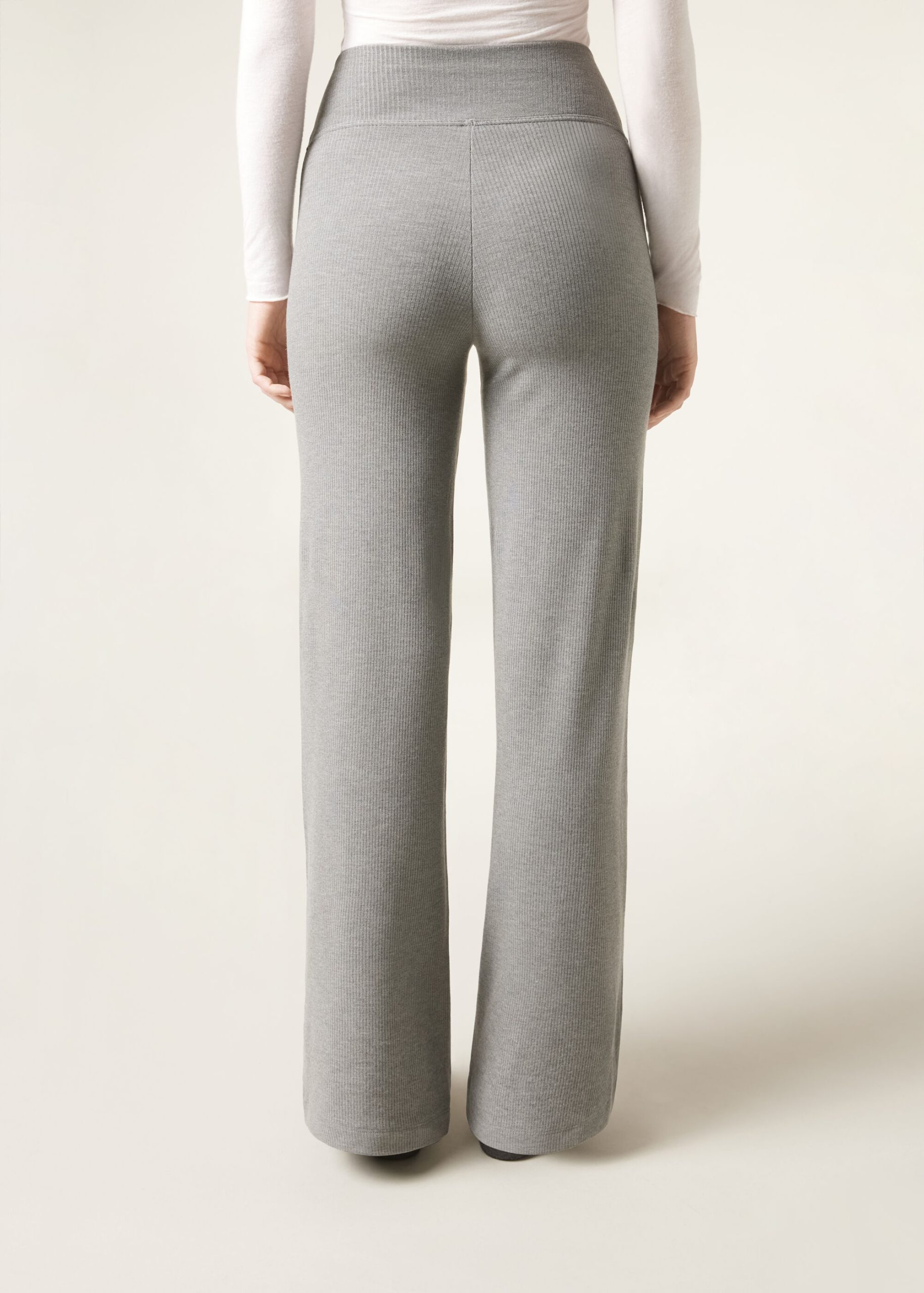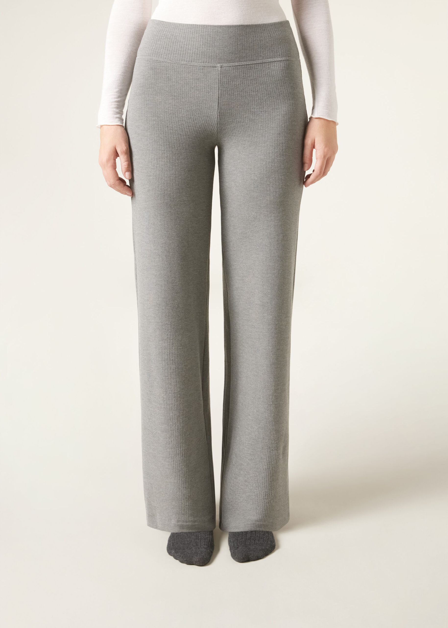 Women’s ribbed cashmere blend modal palazzo pants featuring a comfortable, elastic-free high waist. The fabric is opaque, soft, and breathable, with a brushed interior for a warm and comfortable effect, perfect to combine style and comfort on the coldest days.