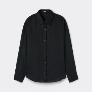 Cropped button-down shirt in linen, perfect for those who love natural fibers, with shirt collar and long sleeves.