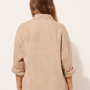 Cropped button-down shirt in linen, perfect for those who love natural fibers, with shirt collar and long sleeves.