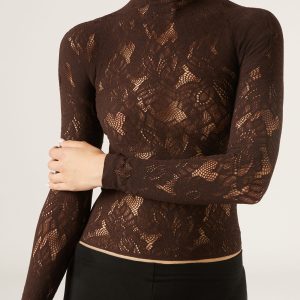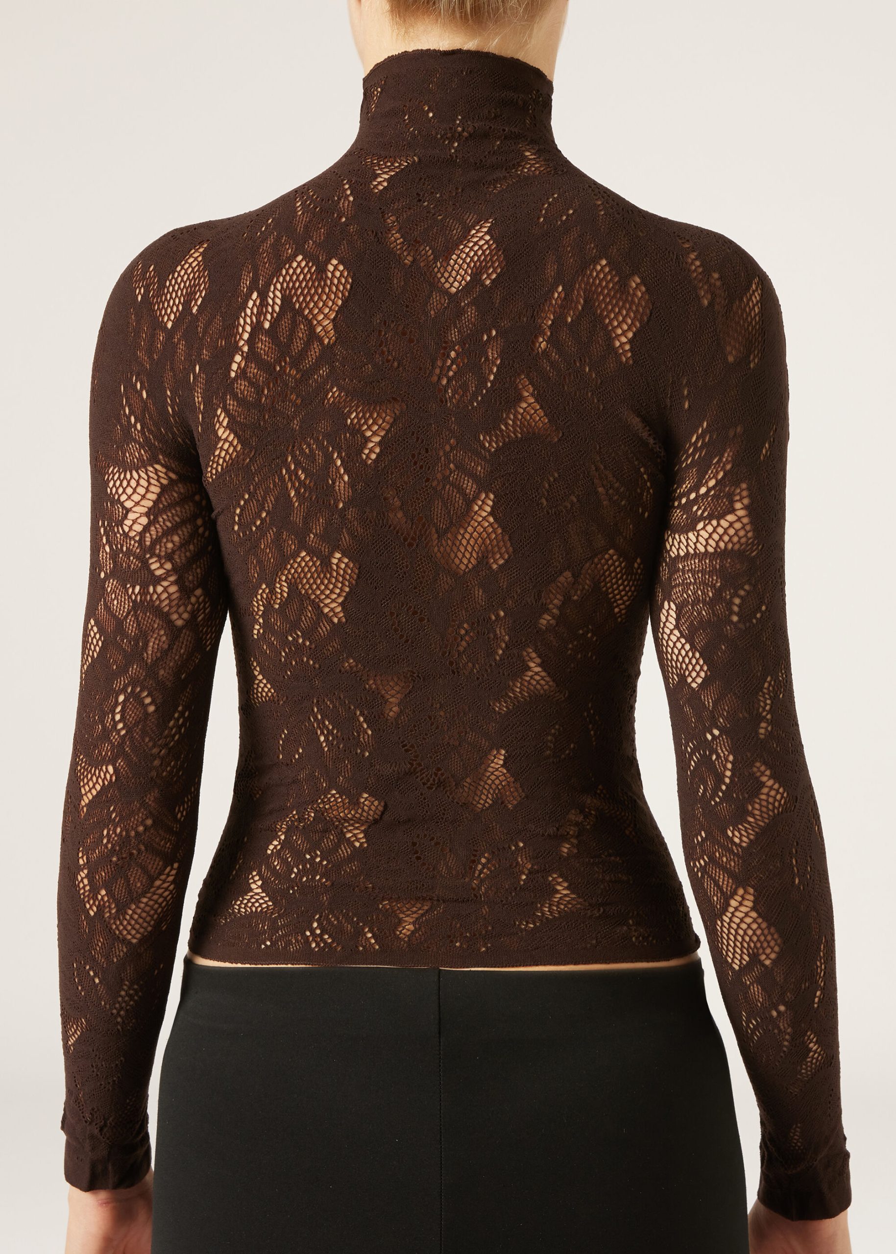Floral motif mesh top, perfect to pair with coordinating tights MODC2185. With a funnel neckline and long sleeves, it is the ideal ally for an elegant and sophisticated look, even under a jacket.