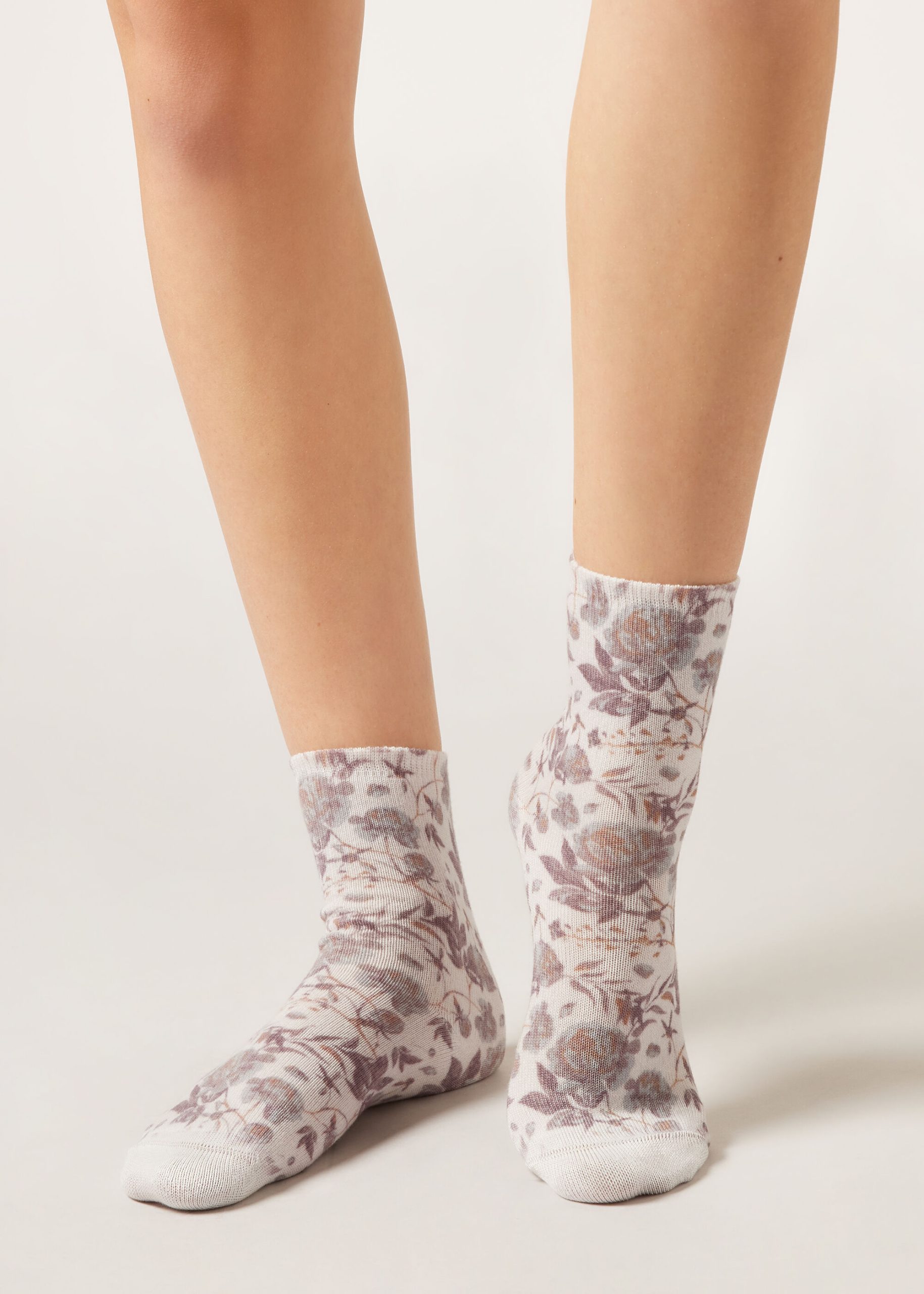 Women’s short socks with a floral digital print in delicate colors for a fresh and feminine look, perfect for a refined and original aesthetic.