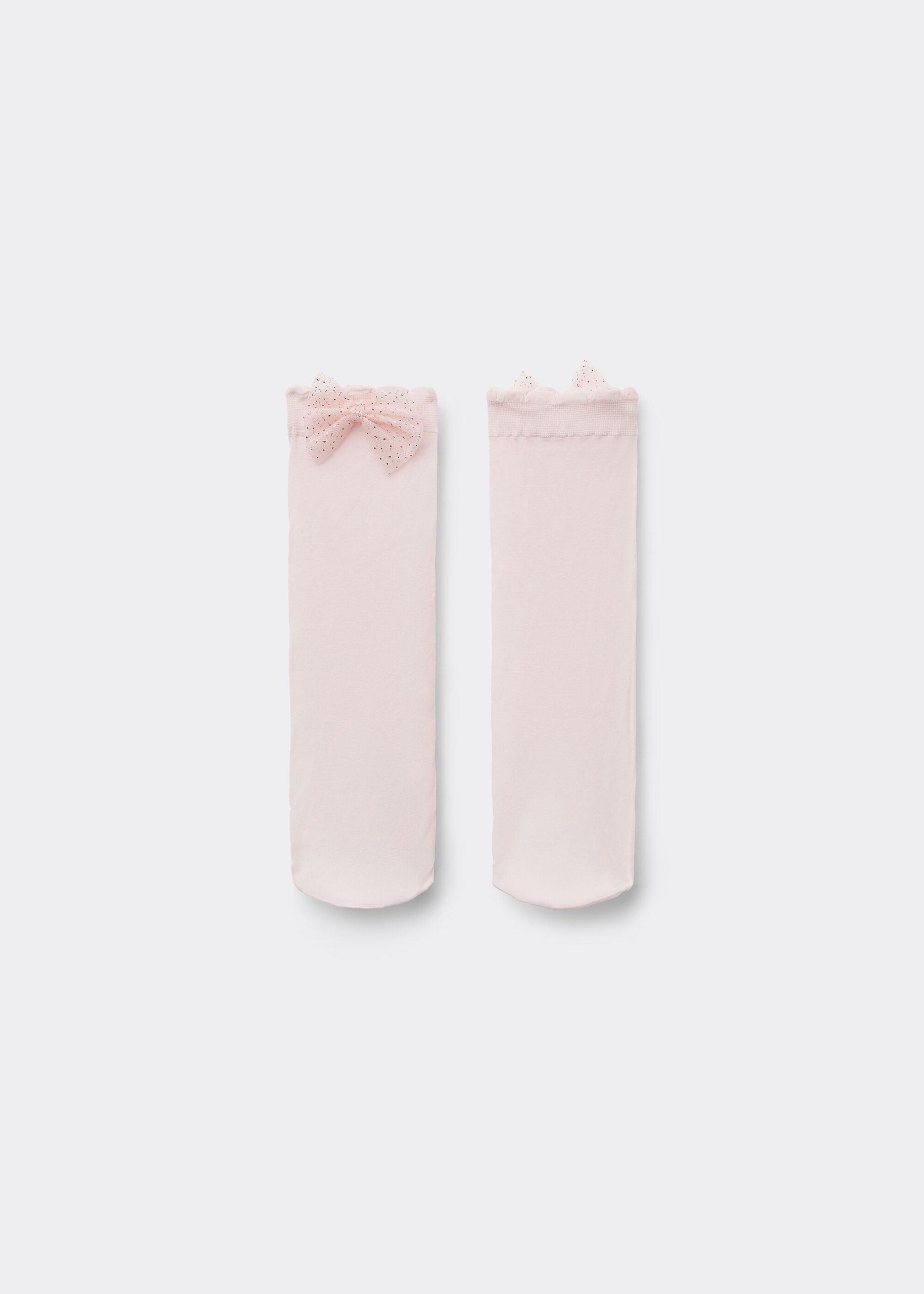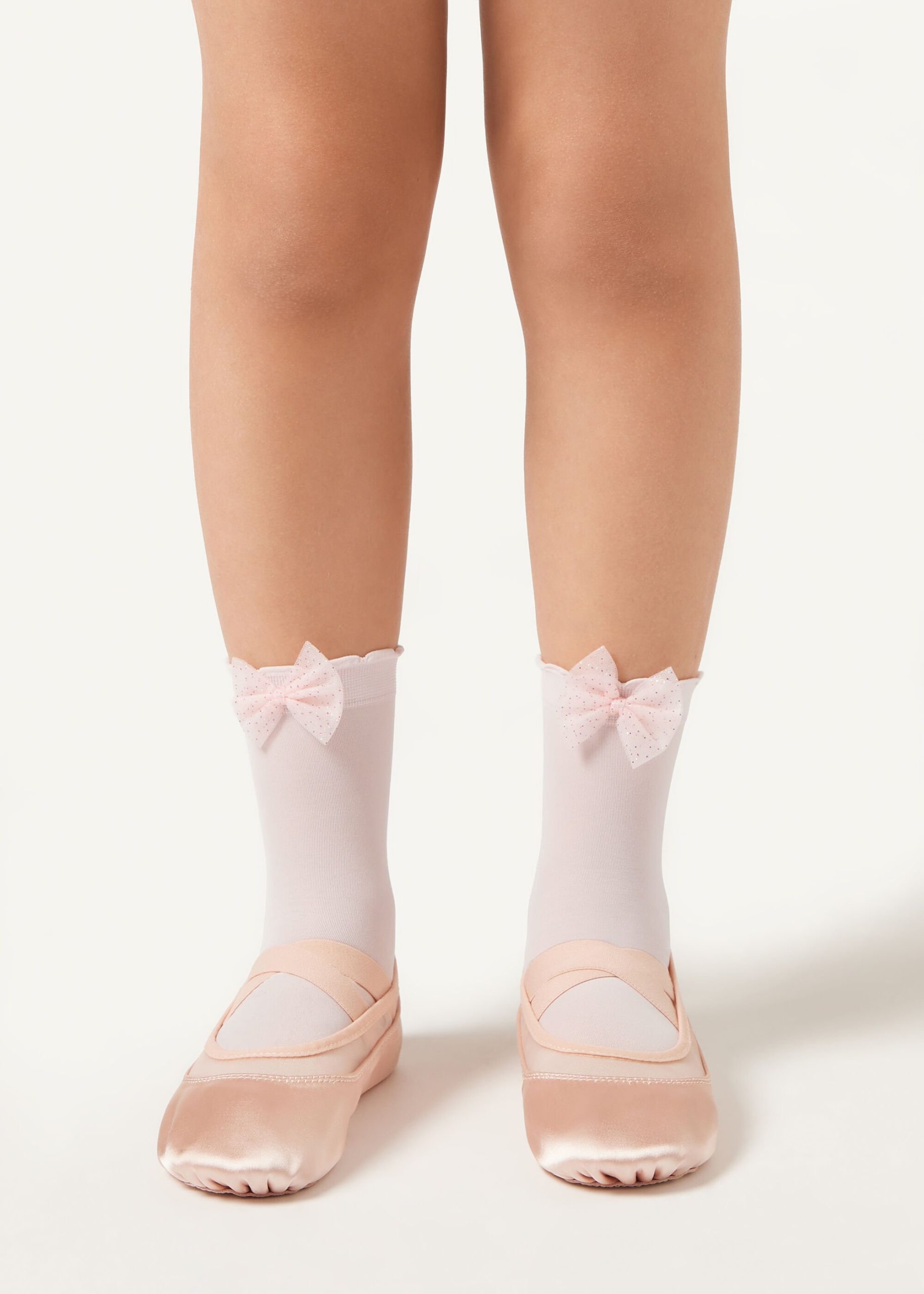 Girls’ 30 denier microfiber short socks with elegant tulle bow with glitter appliqué, trimmed with a scalloped edge.
