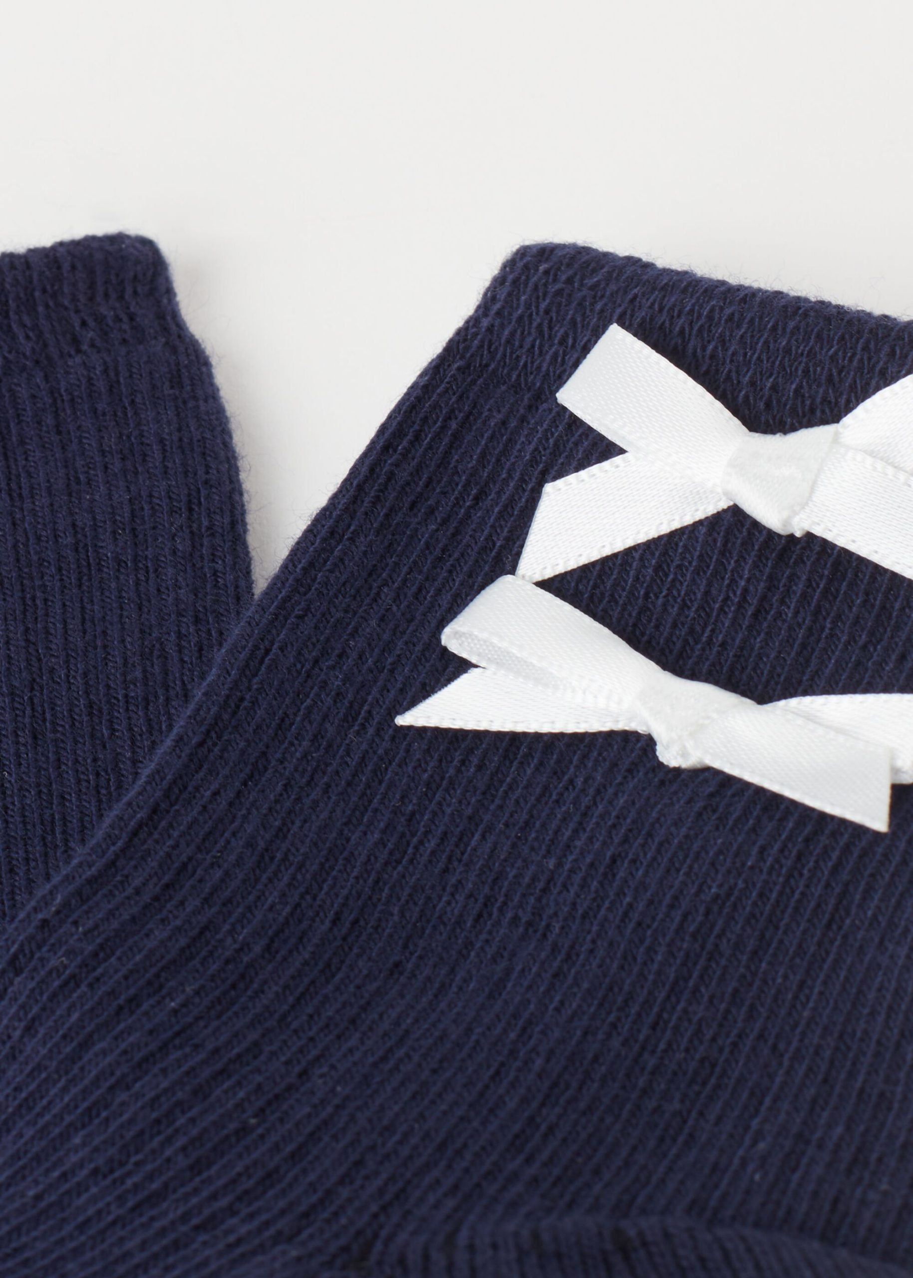 Girls’ short soft cotton socks featuring a ribbed construction and an elegant bow appliqué.