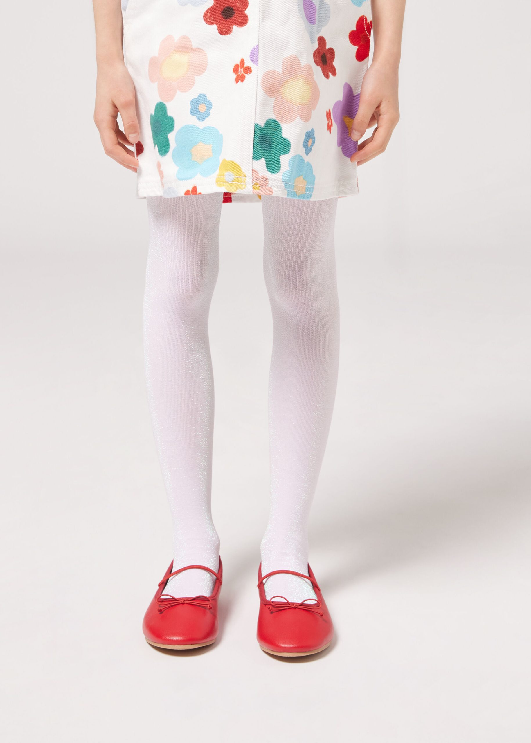 Girls’ opaque 70 denier tights featuring shiny colored glitter.