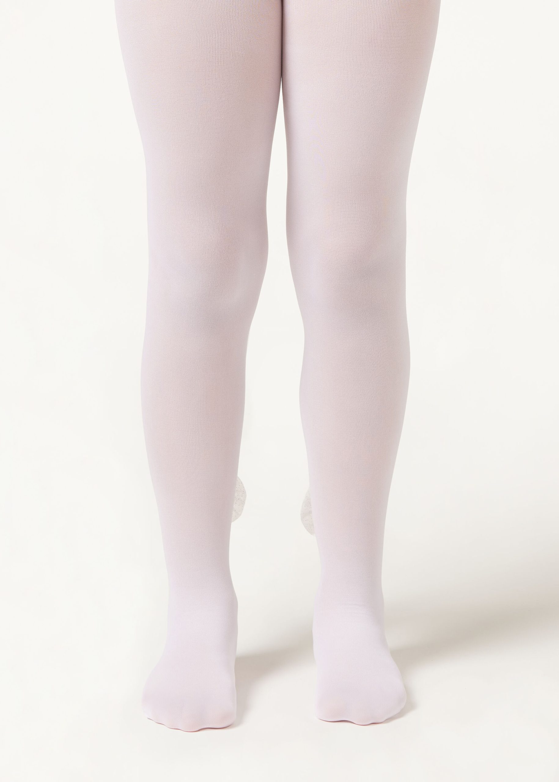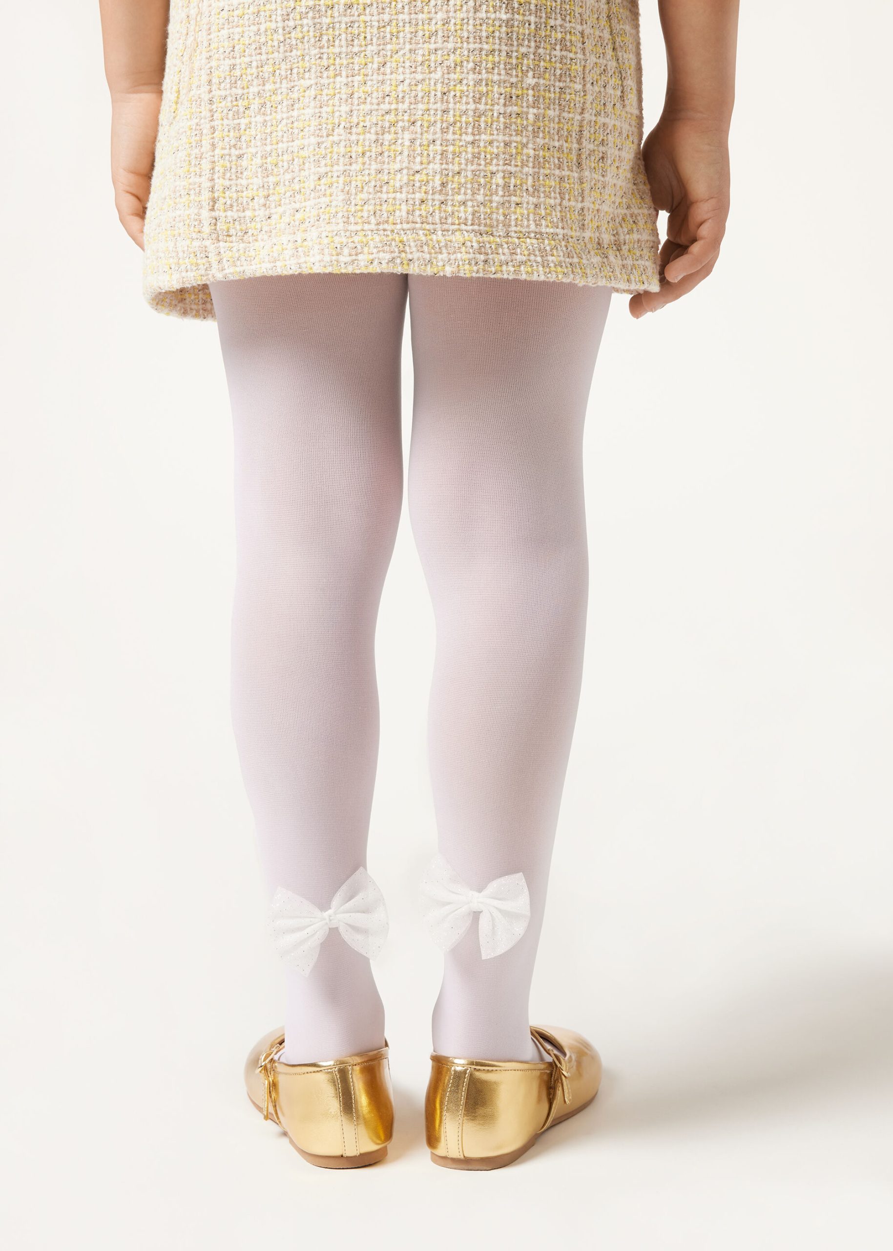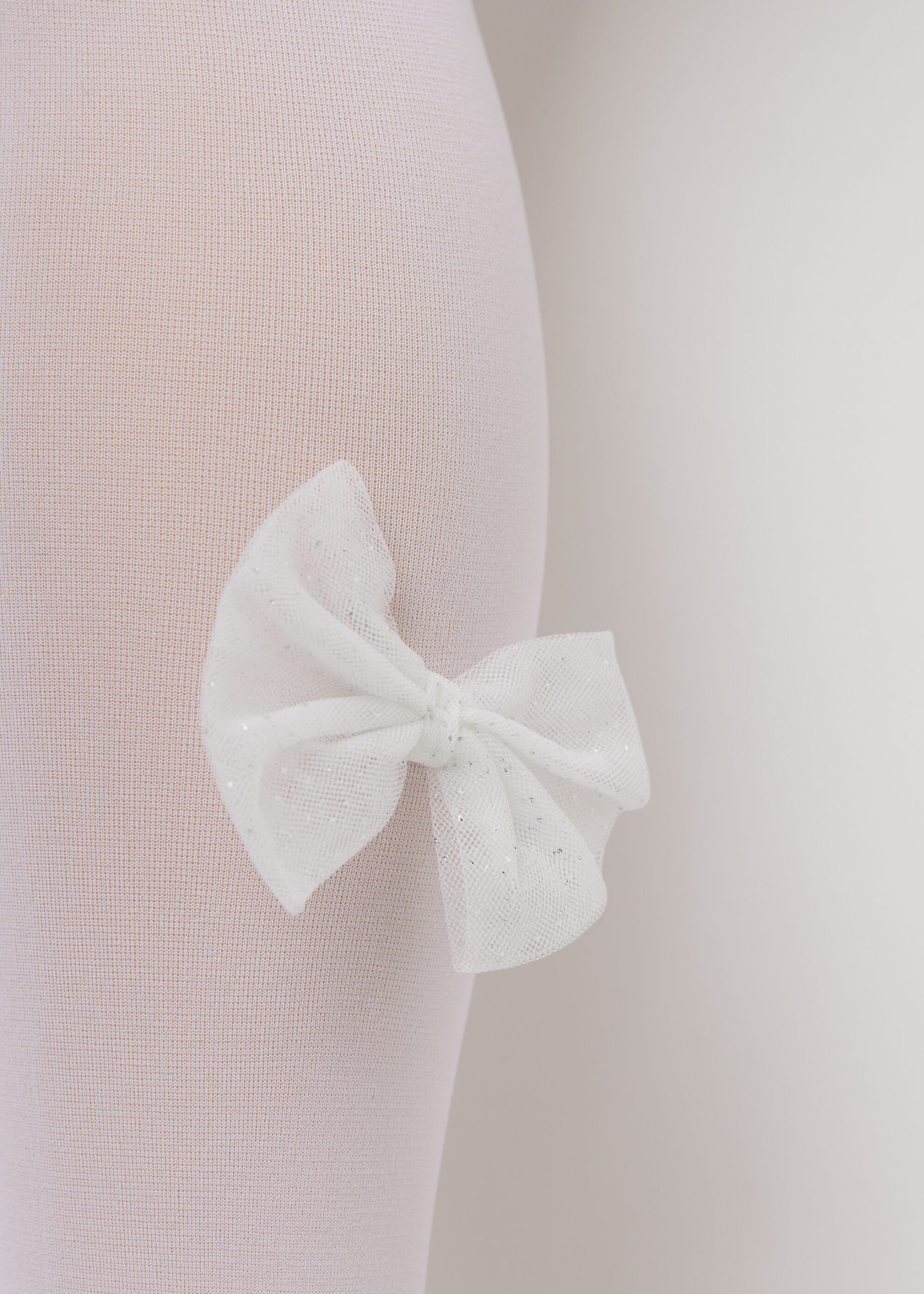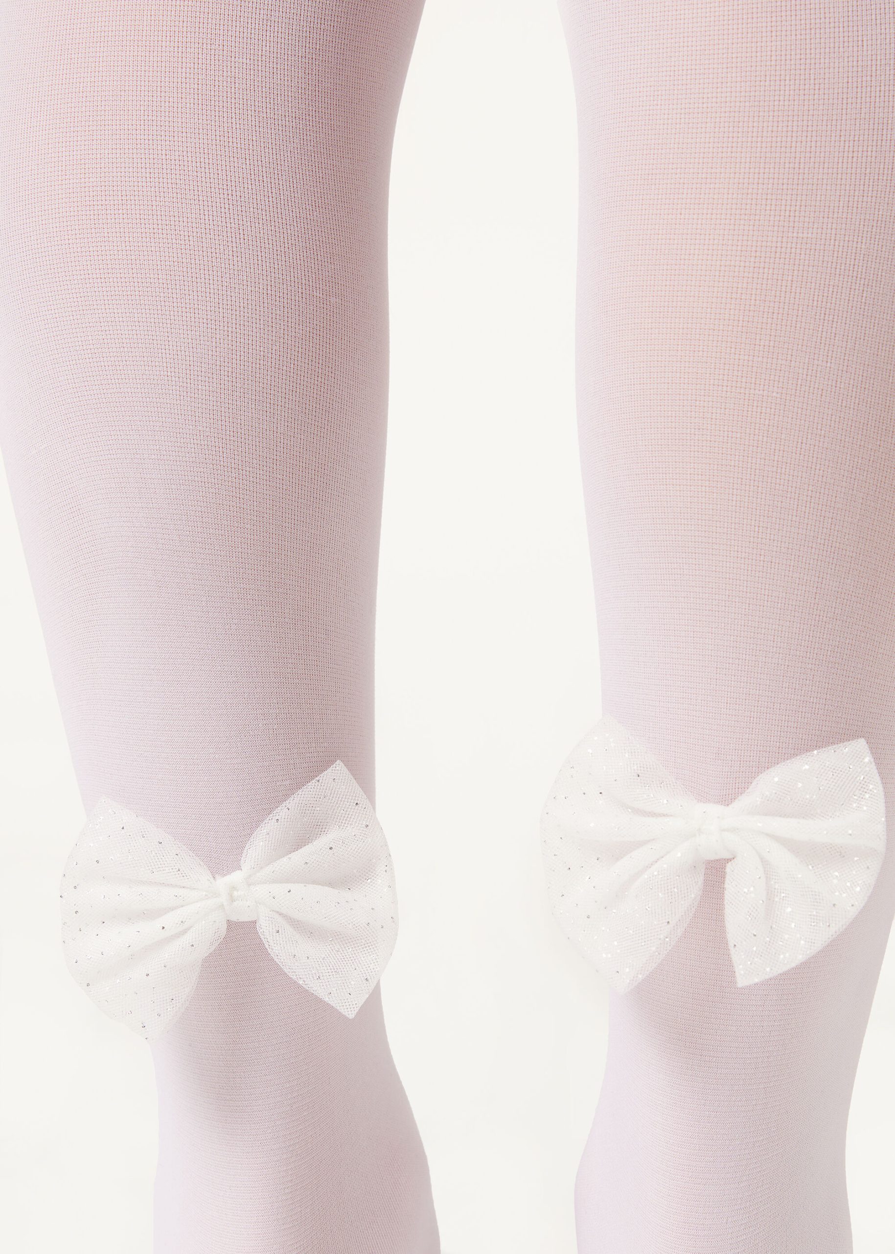Girls’ opaque 30 denier tights with an elegant tulle bow appliqué and glitter at ankle height.