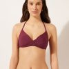 Bandeau bikini top with underwire, graduated padding cups, and side boning to guarantee good support, perfect for those with larger busts. The style features a bright fabric with a silky effect with ruffles. Adjustable and removable straps. Back tie closure.