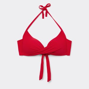 This criss-cross swimsuit top features a fixed triangle shape with graduated padding in the cups, adding subtle volume to enhance your natural curves. The criss-cross detail at the neckline not only adds a trendy touch but also creates a flattering, sculpted effect. Plus, you can customize the fit further with the back tie closure which ensures a secure fit contoured to your body and shape. The soft, breathable fabric feels luxurious against the skin, ensuring comfort for hours, whether you’re lounging or swimming. Designed with versatility in mind, the adjustable shoulder straps feature eyelets, allowing you to either hook them to the back band for a classic fit or tie them behind the neck for a chic crossover bikini top look. The lightly padded cups in size XL/40 provide extra comfort and support, making this bikini top ideal for both style and function. Perfect for pairing with your favorite swim bottoms, the crossover bikini top is a must-have for your swimwear collection if you’re looking for subtle wrap over style.