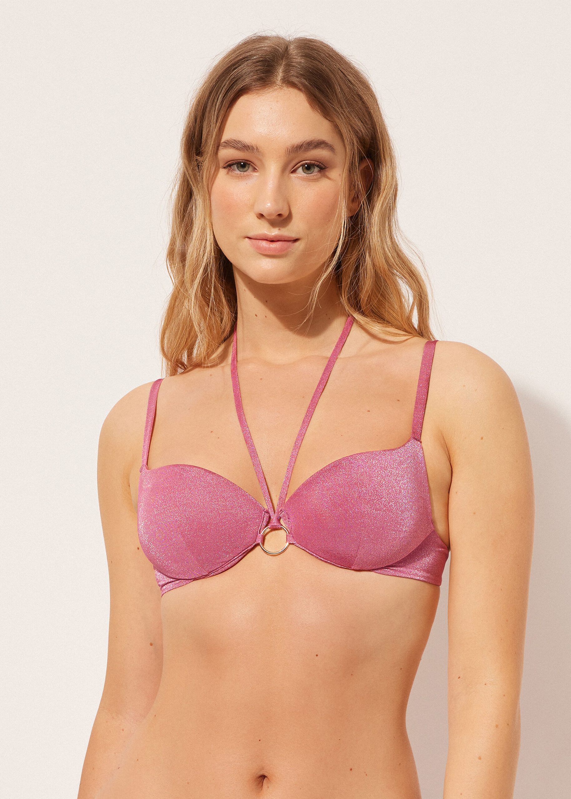 Push-up bikini top with graduated padding and underwire for more volume at the bust. Soft fabric with shiny lamé thread embellished with nickel free small gold rings. Adjustable straps and back hook closure.