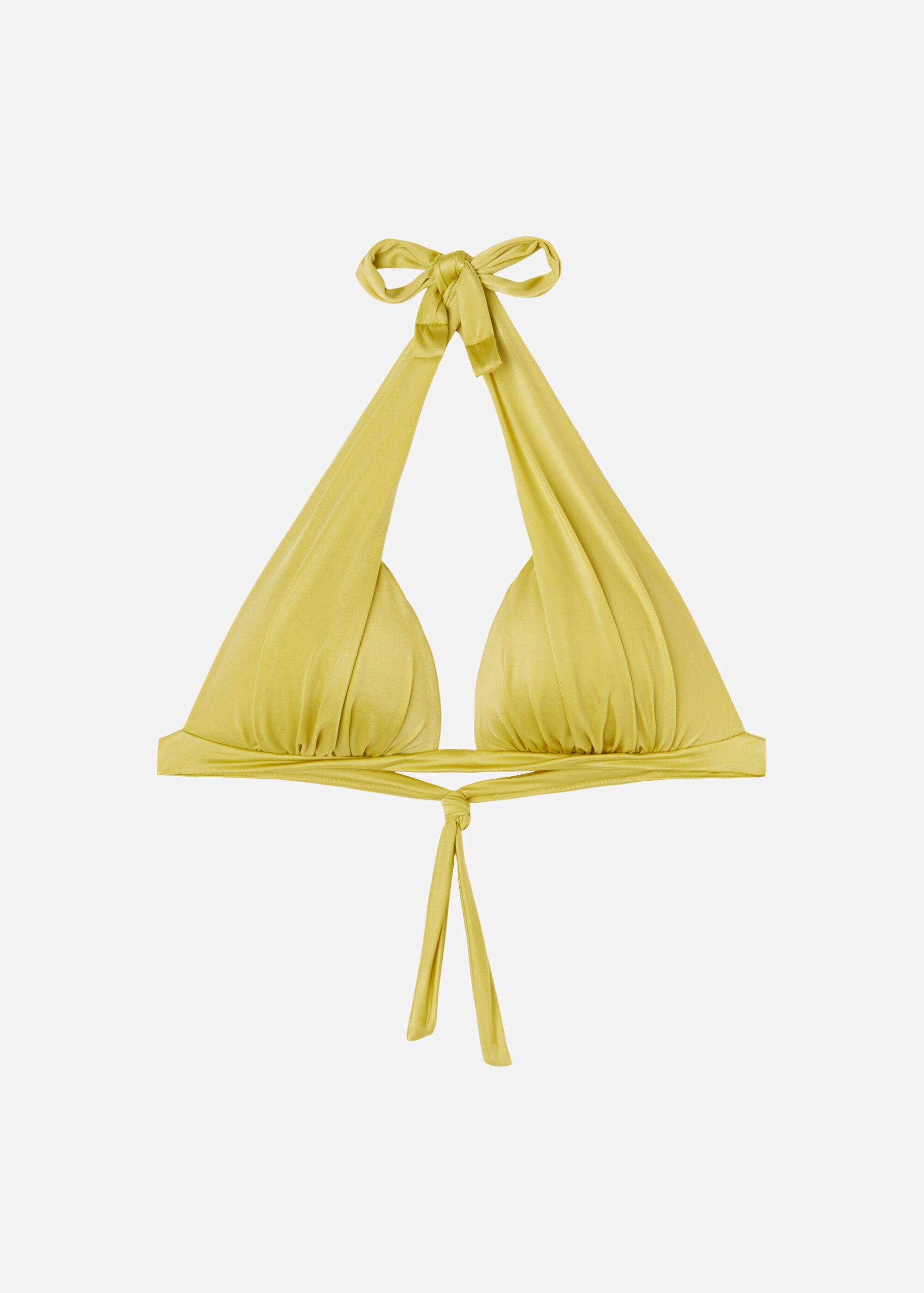 Wireless fixed triangle bikini top with graduated padded cups that add volume to enhance the décolleté. The style features a bright fabric with a silky effect, embellished by ruffles. The shoulder straps have eyelets on the ends so they can be hooked onto the back band or tied behind the neck. Back tie closure.