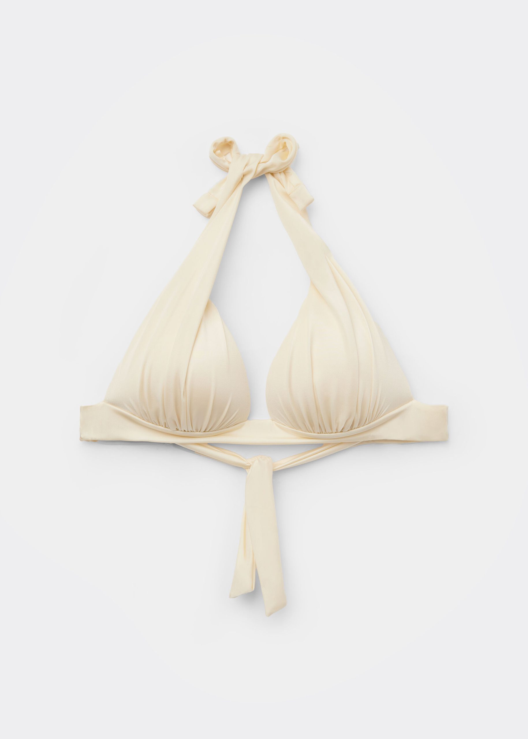 Wireless fixed triangle bikini top with graduated padded cups that add volume to enhance the décolleté. The style features a bright fabric with a silky effect, embellished by ruffles. The shoulder straps have eyelets on the ends so they can be hooked onto the back band or tied behind the neck. Back tie closure.