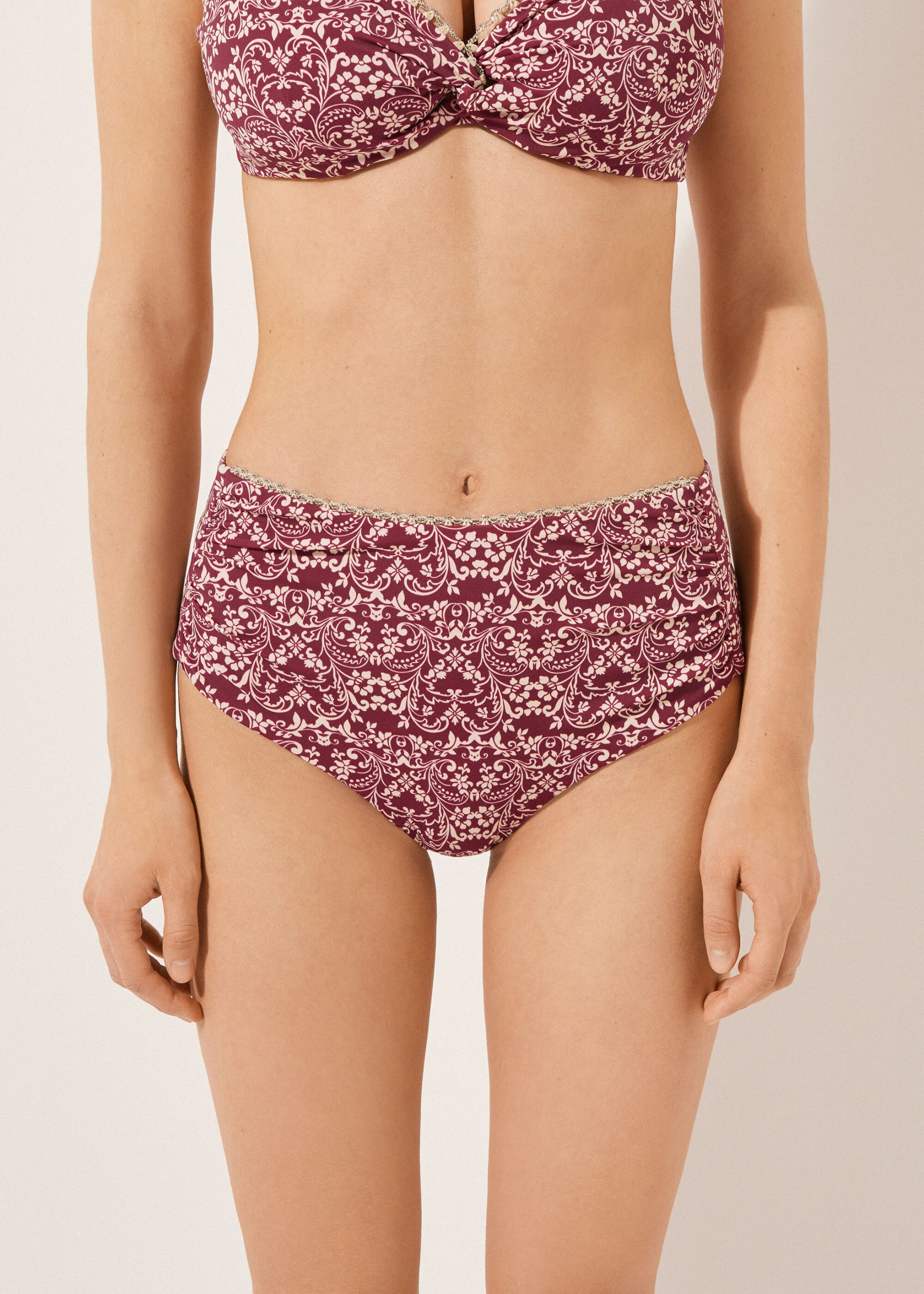Bikini bottoms with a high waist with a shaping effect on the abdomen, guaranteed by a special tulle at the front. An elegant floral pattern with shades of burgundy that creates a refined and natural look. Fully lined with invisible seams.