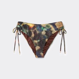 High-waist bikini bottoms with side drawstrings to adjust the fit of the leg openings, embellished with golden tips. The style features a lamé fabric with a camouflage print. Fully lined with invisible seams.