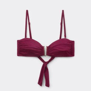 Bandeau bikini top with lightly padded cups. The side boning guarantees good support. The style features shiny fabric with a golden accessory at the center of the bust. Adjustable and removable straps. Back tie closure.