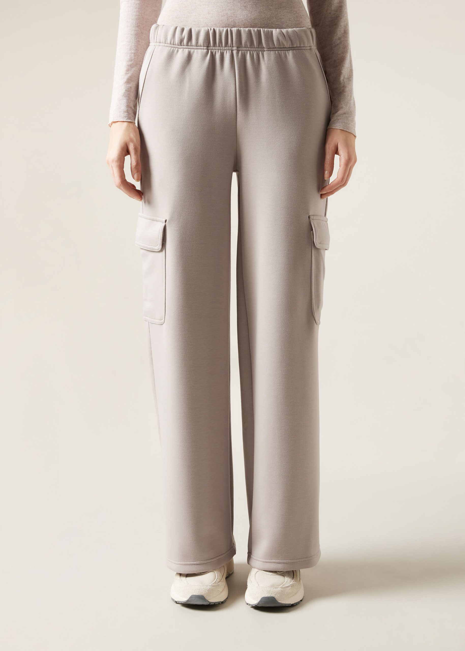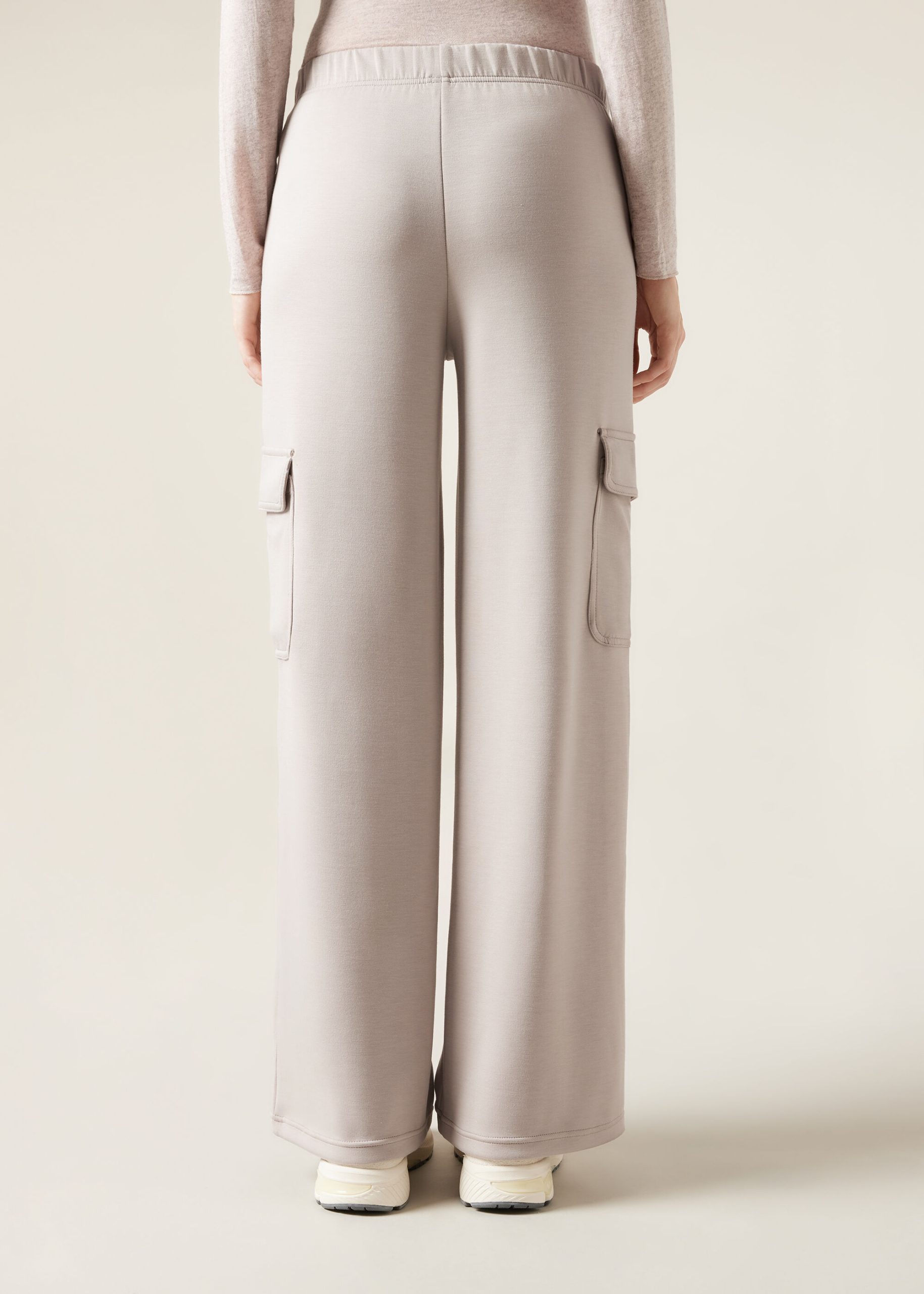 Cargo pants in high quality soft touch modal blend fabric, extremely supple and comfortable to the touch. Feature an elastic waistband and practical cargo-style patch pockets, they combine elegance and functionality for a modern and versatile look.