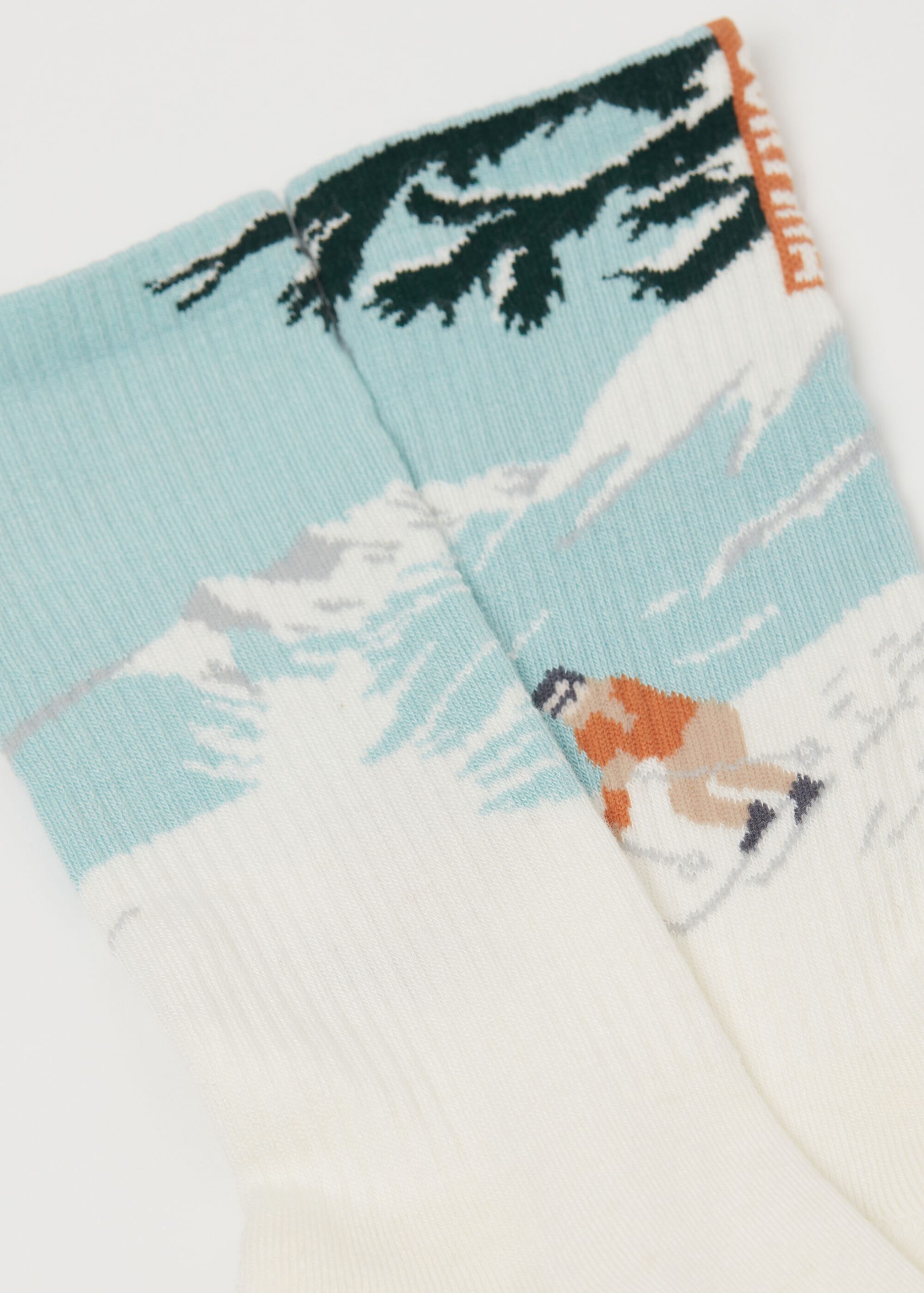 Women’s short socks with cashmere and a terry cotton sole, with a sporty look and pattern inspired by stunning mountain town scenery. Perfect for facing winter days in comfort and with a touch of elegance, they offer softness and warmth, ideal for those seeking a glamorous look and wanting to stand out during outdoor activities.