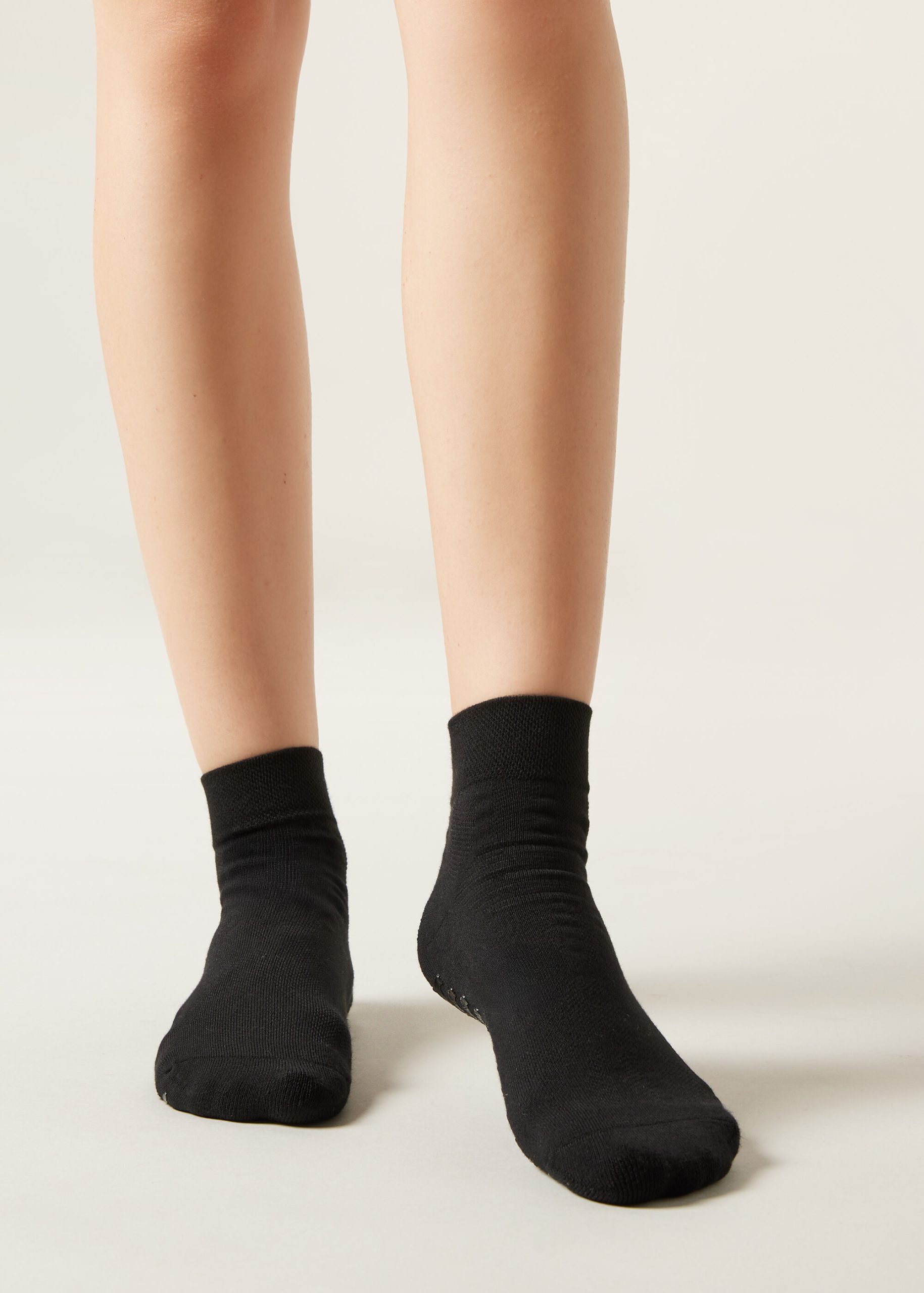 Women’s short, non-slip socks in soft cotton with non-slip material on the soles and reinforced heels and toes for long-lasting comfort.