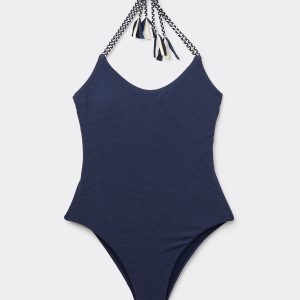 One piece swimsuit, wireless and unpadded for a natural and comfortable effect. It features a two-tone string fastening behind the neck and an elegant crinkled fabric with a 3D look. The braided string tied at the waist adds a touch of refinement. The regular fit on the bottom and classic design make it perfect for any occasion at the beach.