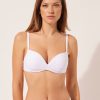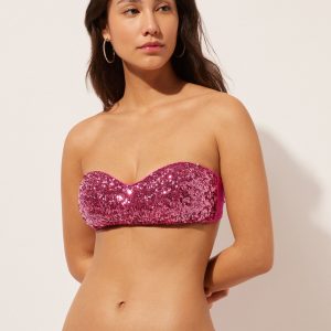 Bandeau bikini top with underwire, graduated padding cups, and side boning to guarantee good support, perfect for those with larger busts. Bright and radiant sequined fabric in bold colors, perfect for a look that grabs attention with its shimmering effect. Adjustable and removable shoulder straps. Back tie closure.