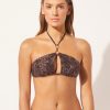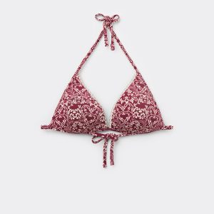 Fixed triangle bikini top with no underwire and with graduated padded cups that add volume to enhance the décolleté. An elegant floral pattern with shades of burgundy that creates a refined and natural look. The shoulder straps have eyelets on the ends so they can be hooked onto the back band or tied behind the neck. Back string tie closure.