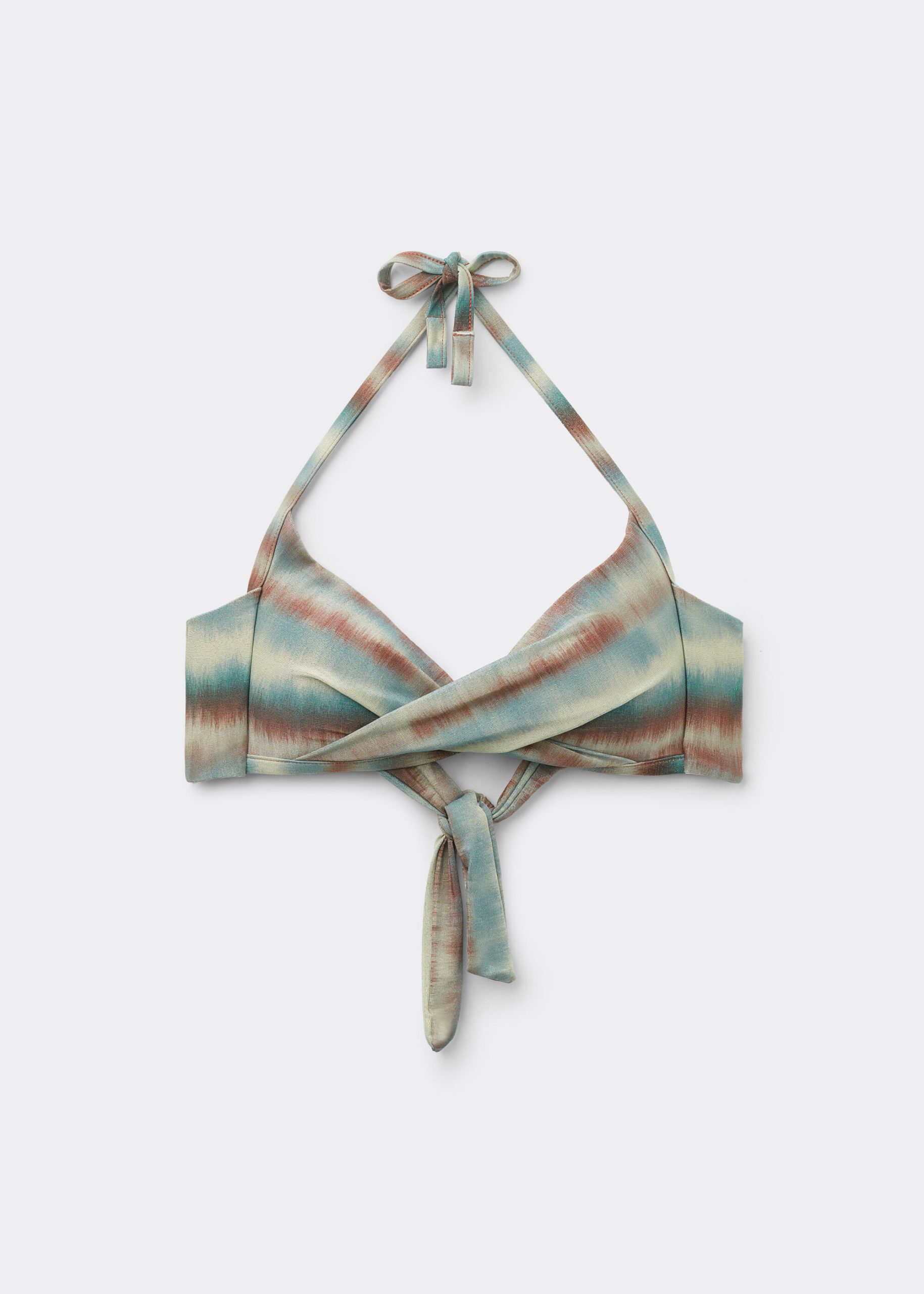 Wireless fixed triangle bikini top with graduated padded cups that add volume. The crisscross on the neckline enhances the décolleté. The fabric brings the colorful shades typical of tie-dye together with glittery details for a bright and vibrant look. Back tie closure. The cups in size XL/40 are lightly padded.