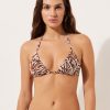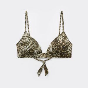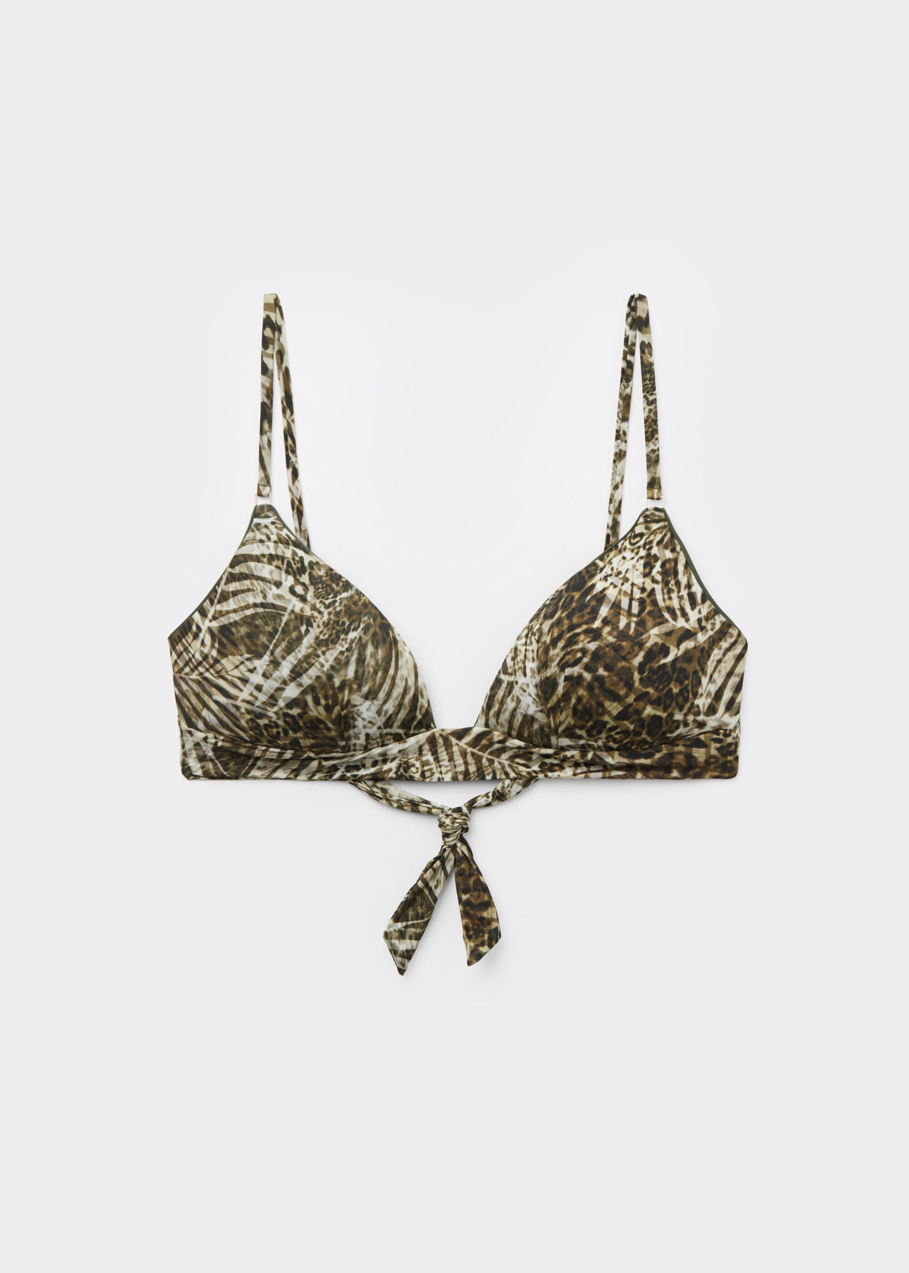 Wireless fixed triangle bikini top with graduated padded cups that add volume to enhance the décolleté. Reminiscent of animal print, the foliage pattern brings together exotic leaf designs with motifs that evoke markings from the animal world. Adjustable fixed shoulder straps. Back tie closure.
