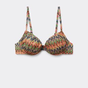 Push-up bikini top with lightly padded cups and underwire to guarantee support and provide volume. The multicolored pattern, featuring a wave motif and a bold mix of bright colors, has a dynamic effect ideal for the summer. Fixed Shoulder Straps. Back closure with two sets of hooks to improve the fit of the underband.
