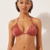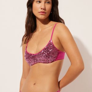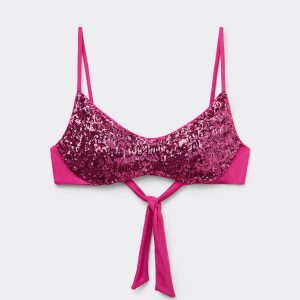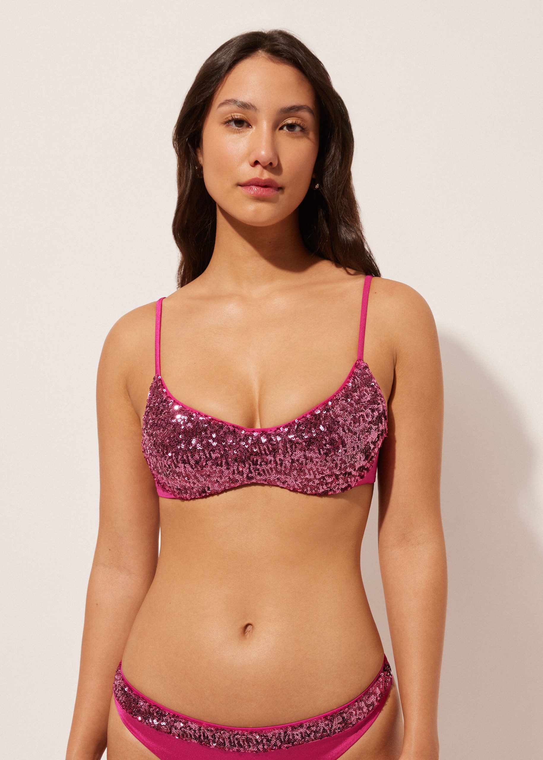 Tank-style bikini top with underwire and cups with removable padding. The shiny microfiber fabric is embellished with elegant sequins. Adjustable thin straps. Back tie closure.
