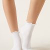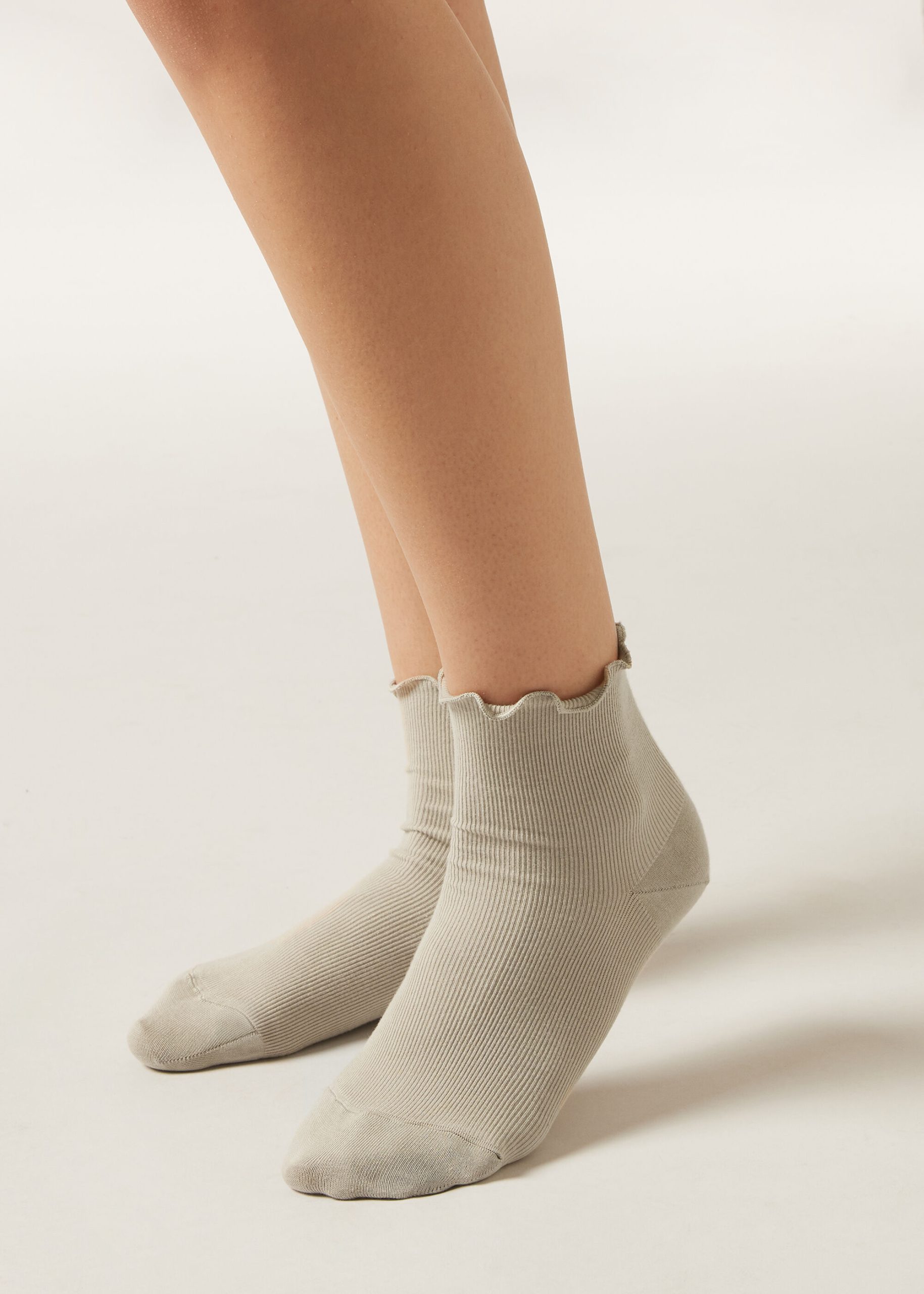 Women’s short ribbed cotton socks with romantic trim detailing.