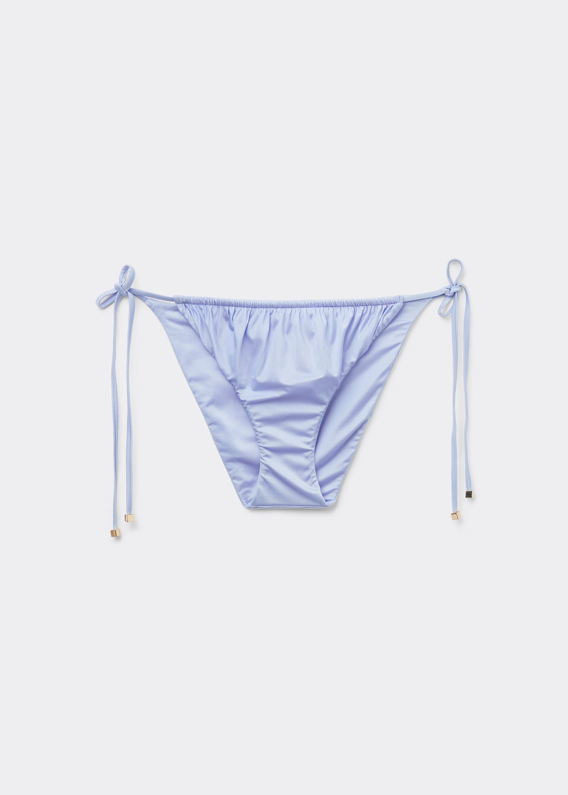 Bikini bottom with side ties to adjust the fit. The style features a bright fabric with a silky effect, embellished by ruffles and gold tips. Fully lined with invisible seams.