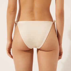 Bikini bottom with side ties to adjust the fit. The style features a bright fabric with a silky effect, embellished by ruffles and gold tips. Fully lined with invisible seams.