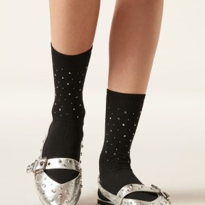 Women’s short socks in soft ribbed cotton combine comfort and a luminous style. The front stud appliqués make them unique, perfect for adding a rock-chic touch to your look.