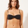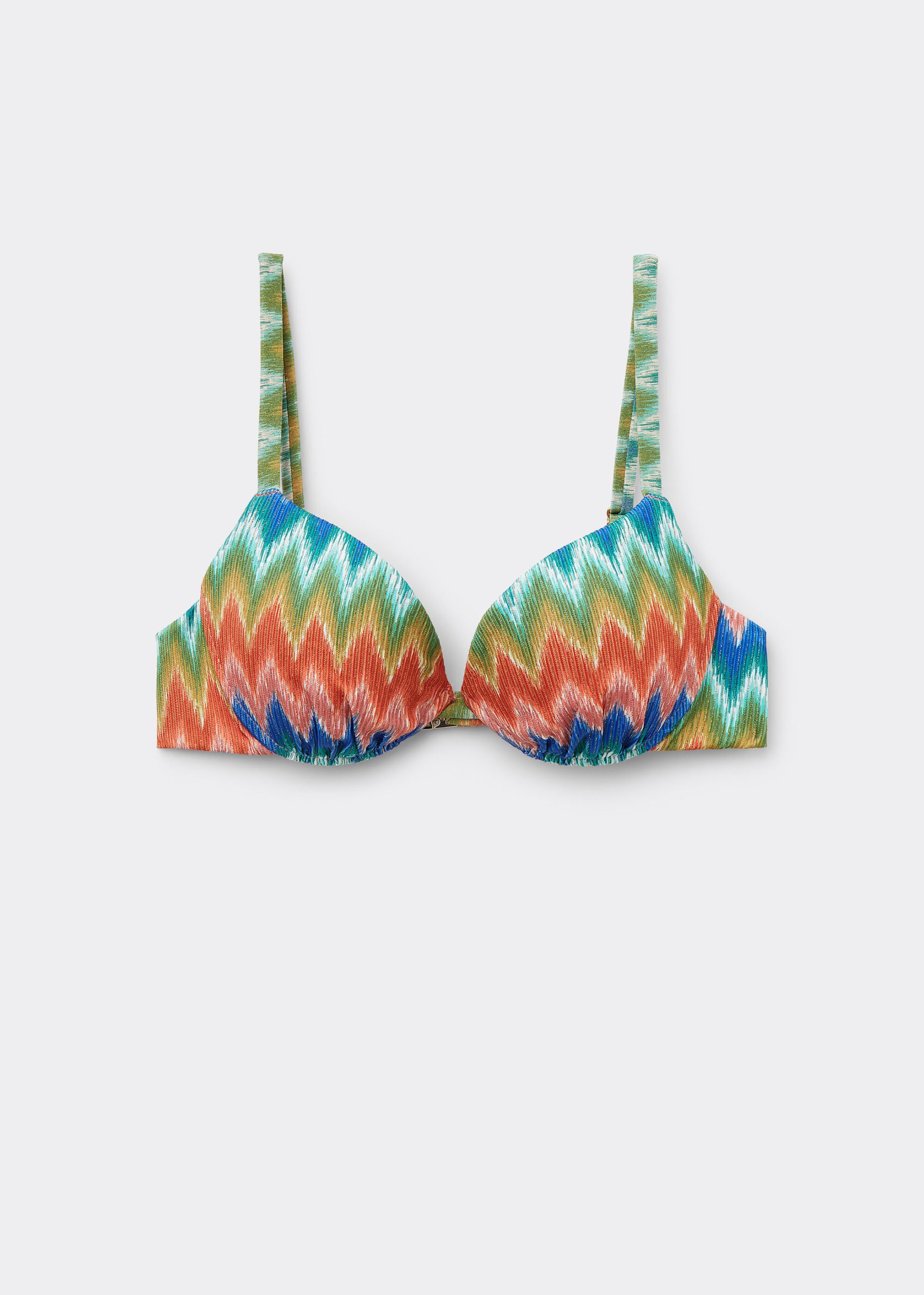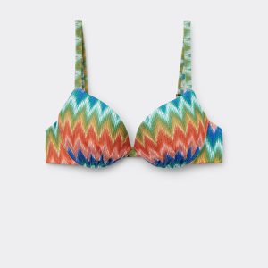 Super push-up bikini top with graduated padded cups and underwire to guarantee support and provide volume. The brightly colored chevron pattern, with its dynamic and sophisticated motif, merges perfectly with the lightly ruched fabric which gives a touch of movement and refinement. The adjustable shoulder straps and thin tie fastening at the back offer a customizable fit. Back closure with two hook-and-eye closures to improve the fit of the underband.