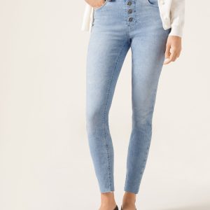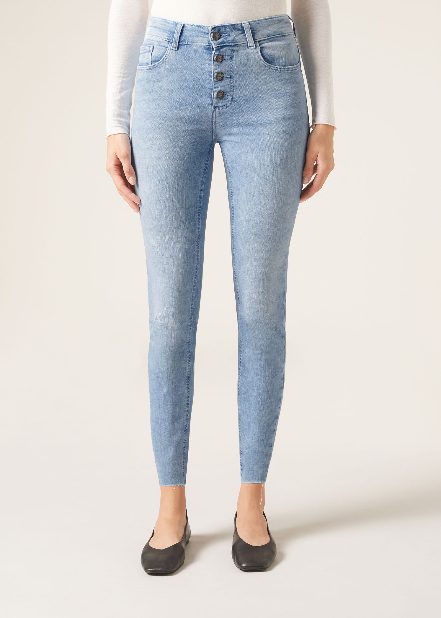 Women’s super skinny five pocket jeans with button fly and belt loops, made in especially comfortable, ultra stretch fabric. Lightly fringed raw edge hems.