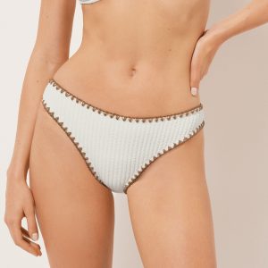 Fully lined bikini bottom with invisible seams in crinkle fabric embellished with contrast color embroidery. The slightly rounded waist at the front allows for both a classic or more high-cut fit, depending on one’s physique.