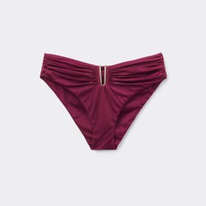 High waist bikini bottom in lined fabric featuring a shiny texture and ruching at the waist with gold accessory closure.