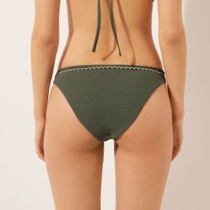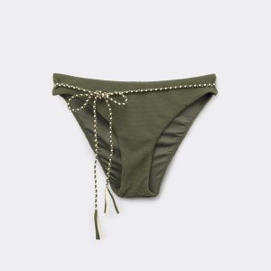 Fully lined bikini bottoms with invisible seams in order to not leave marks. The rounded waist at the front allows for both a classic or more high-cut fit, depending on one’s physique. The 3D-effect crinkle fabric, embellished with laced cording, combines elegance, comfort and coolness for a modern and distinctive summer look.