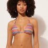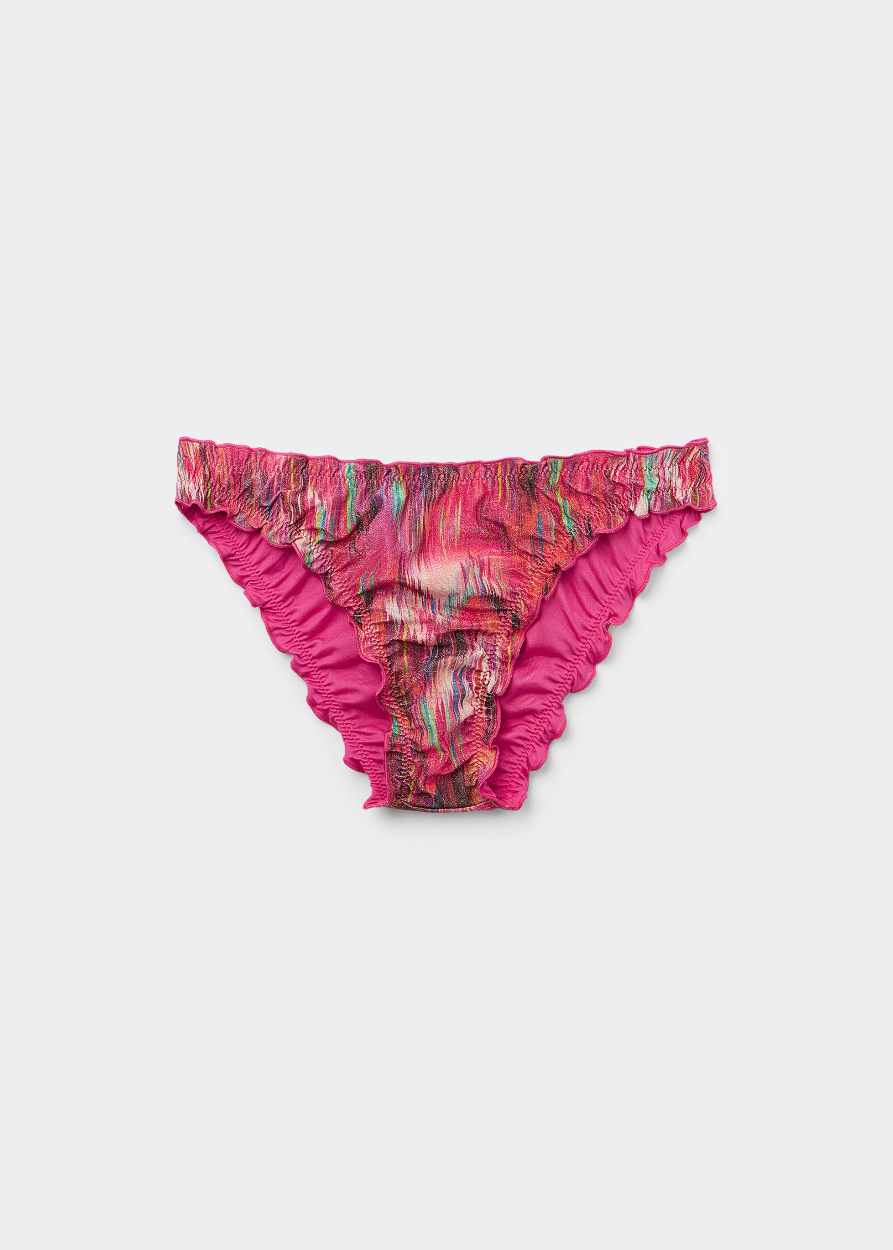 Fully lined bikini bottoms with invisible seams in order to not leave marks. The rounded waist at the front allows for both a classic or more high-cut fit, depending on one’s physique. Pattern illuminated by sparkling glitter, with vibrant patterns in a mix of warm and bright tones. Reminiscent of a refined ethnic style.
