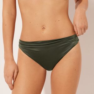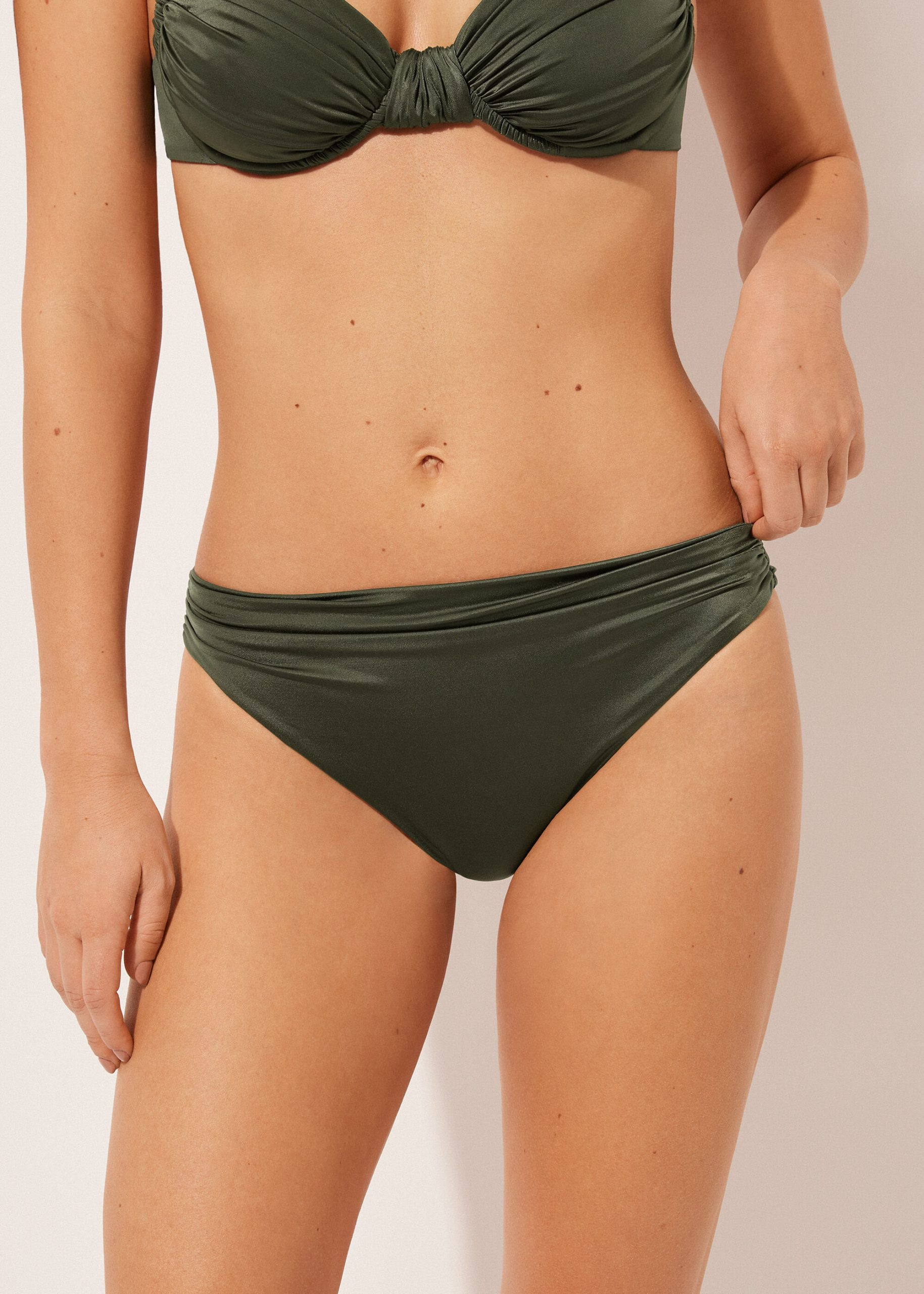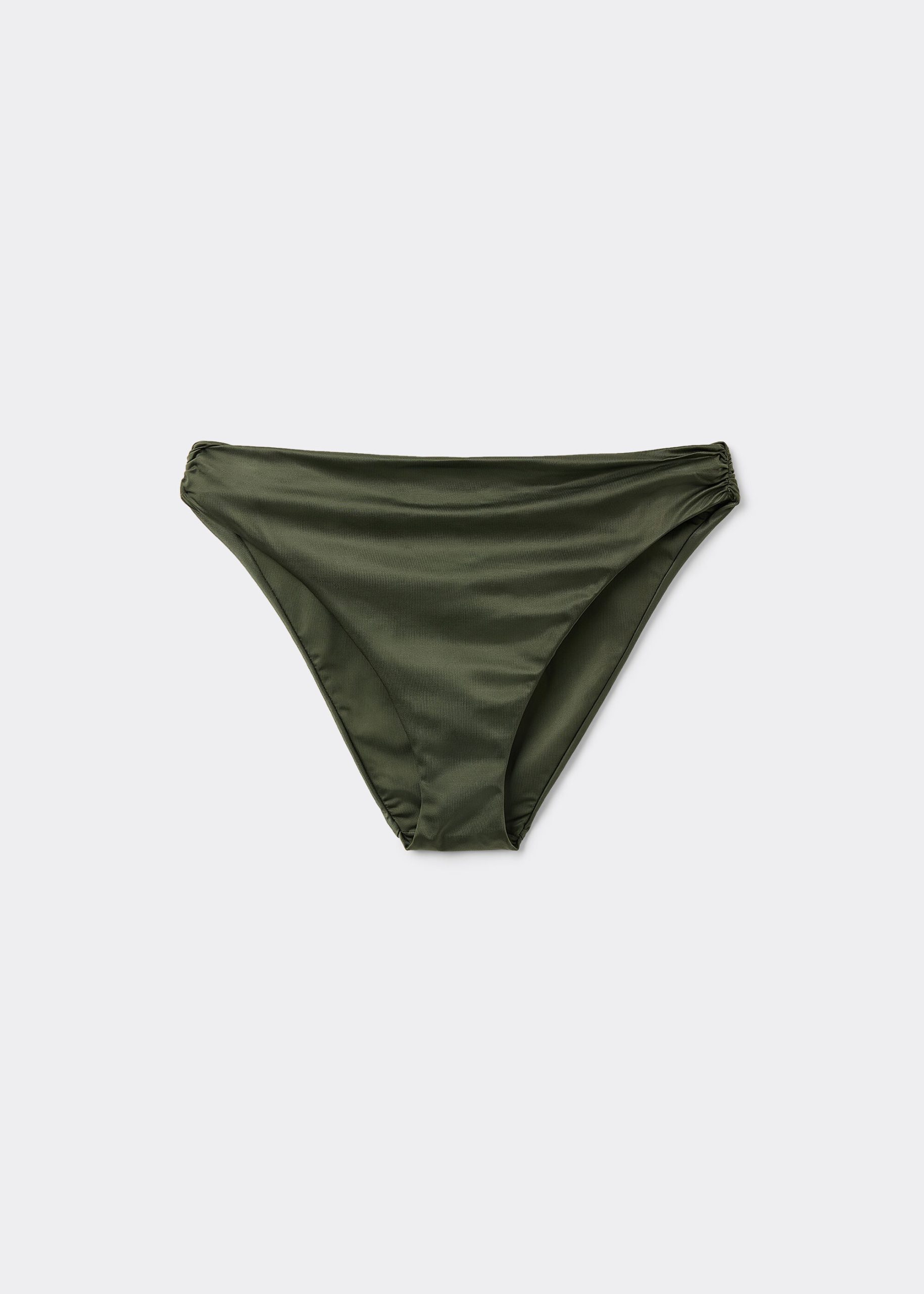 Fully lined bikini bottoms with invisible seams. The style features a bright fabric with a silky effect. The slightly rounded waist at the front allows for both a classic or more high-cut fit, depending on one’s physique.