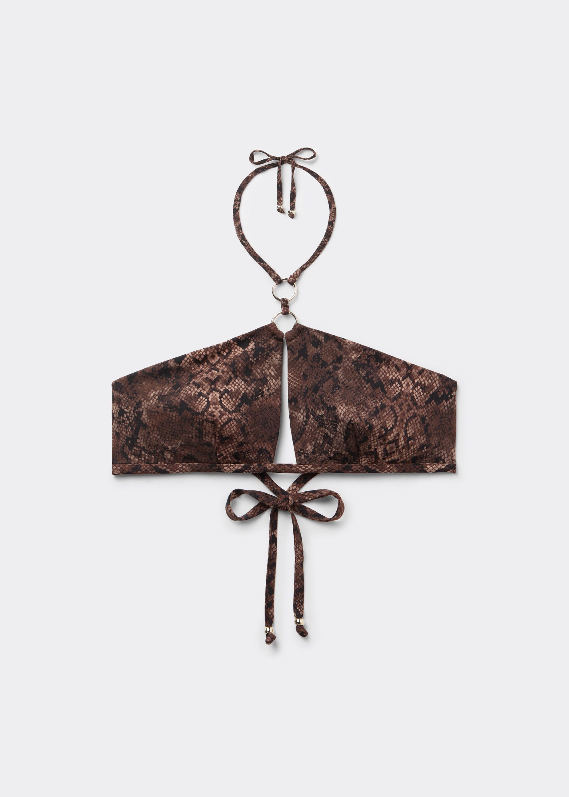 Lightly padded tank-style bikini top, wireless for a natural effect. The side boning helps support the bust. The style features a sophisticated dark brown animal pattern embellished with a cut out at the center of the bust and with small nickel-free rings, providing a touch of modernity and fashion. Back string tie closure.