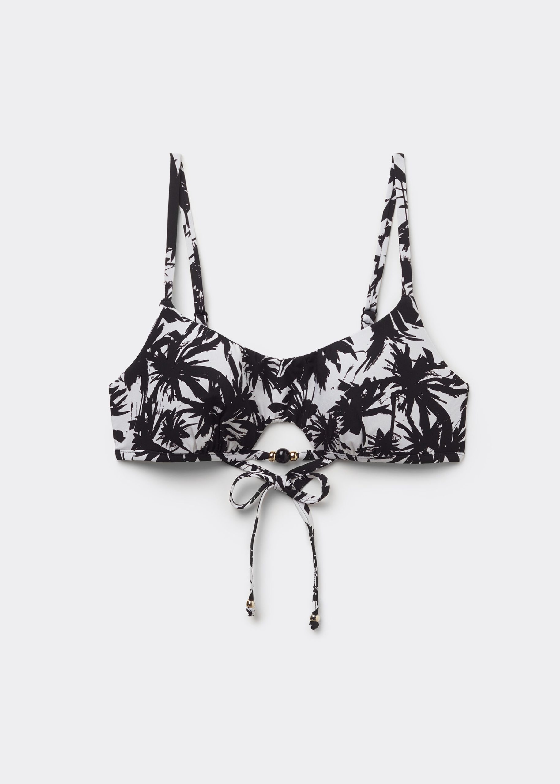 Wireless tank-style bikini top with lightly padded cups. The side boning helps support the bust. The style features an opening at the center of the bust embellished with small two-tone pearls. White and black palm tree print. Adjustable shoulder straps and thin tie closure on the back embellished with small golden pearls.