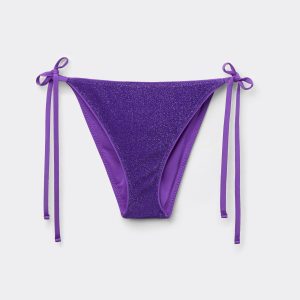 Bikini bottoms with adjustable fit thanks to the side ties. Made from refined shiny lamé fabric offering a bright and sophisticated effect. The slightly rounded waist at the front allows for wear with classic coverage or a higher leg, depending on your body shape. Fully lined.